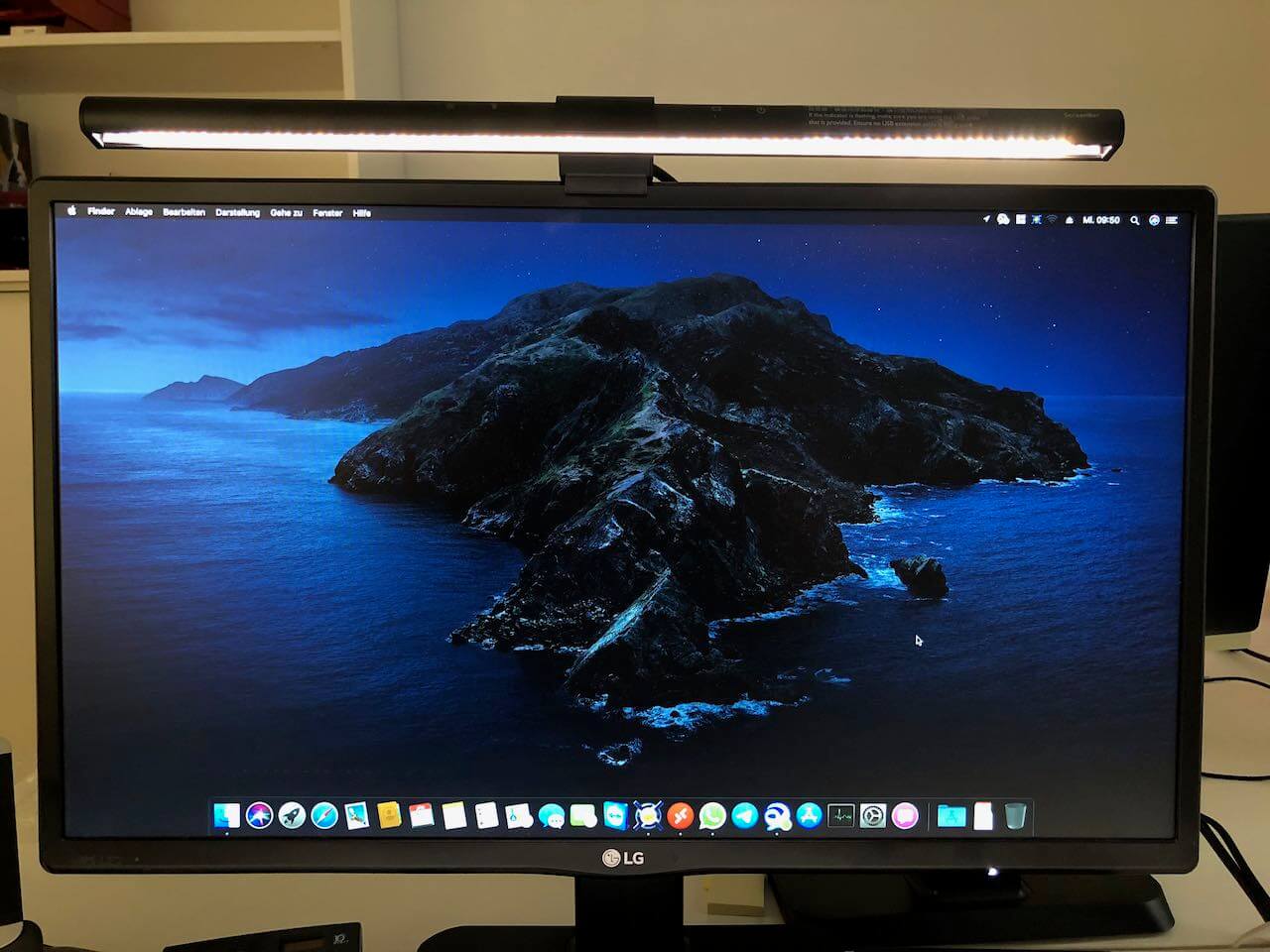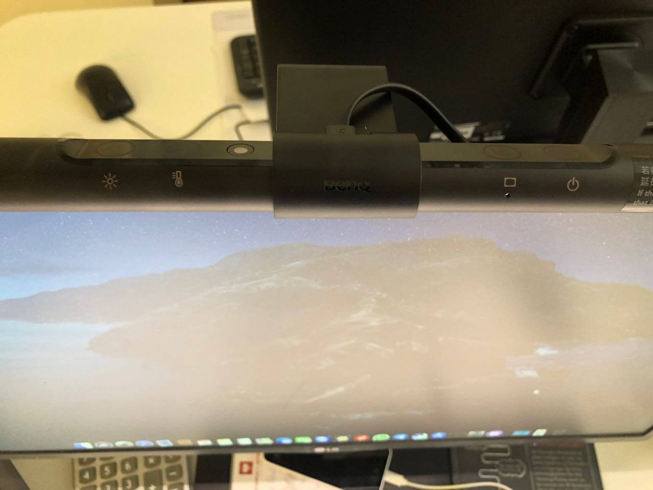 Was die Beleuchtung angeht, so kann ich der ScreenBar nur gute Noten geben. Der automatische Sensor schafft eine angenehme Beleuchtung binnen zwei Sekunden, aber wenn ihr einen wärmeren, sprich gelblicheren Farbton bevorzugt, könnt ihr das ebenso rasch einstellen. Ein Flackern ist nicht festzustellen, und die Helligkeit der BenQ ScreenBar reicht von stimmungsvoll gedimmt bis sehr gut ausgeleuchtet. Ideal für einen Arbeitsplatz, an dem ihr regelmäßig sitzt!