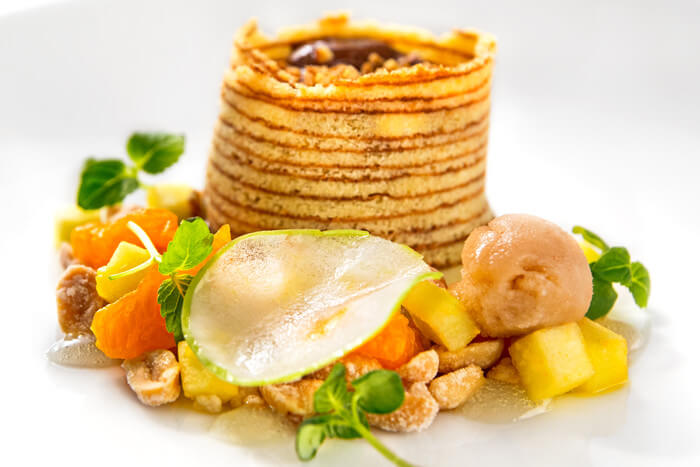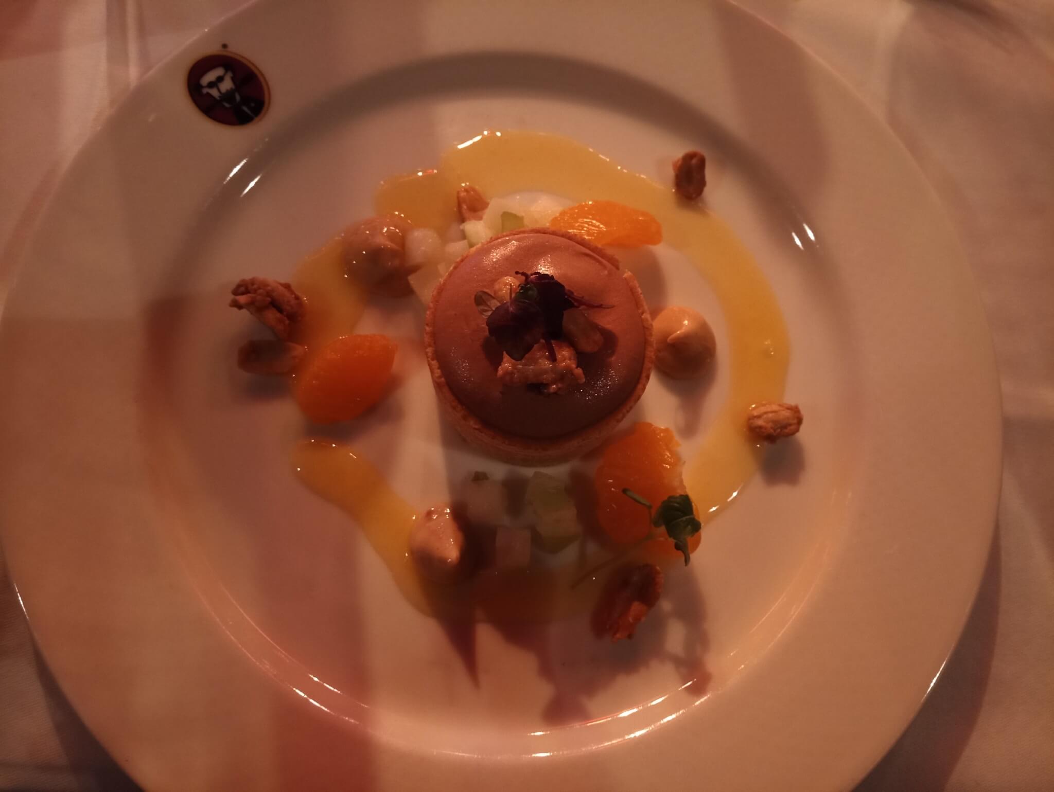 - Dessert: Luftiges Schokoladenparfait im Baumkuchen mit Mandarine, grünem Apfel und Erdnuss