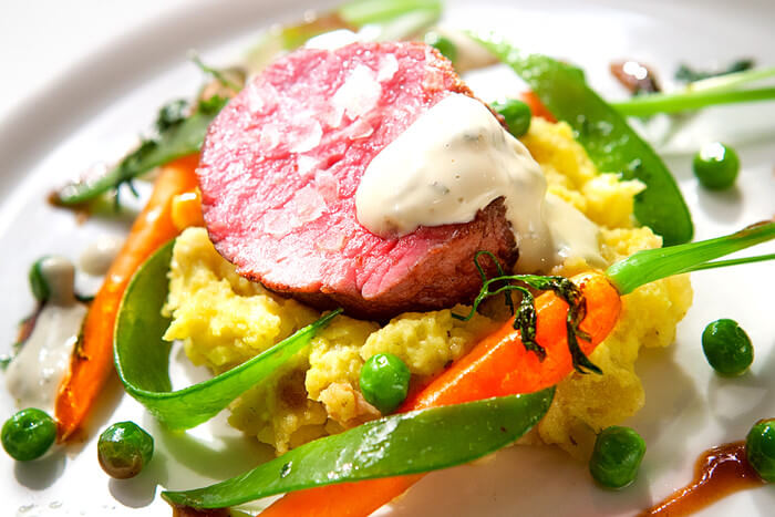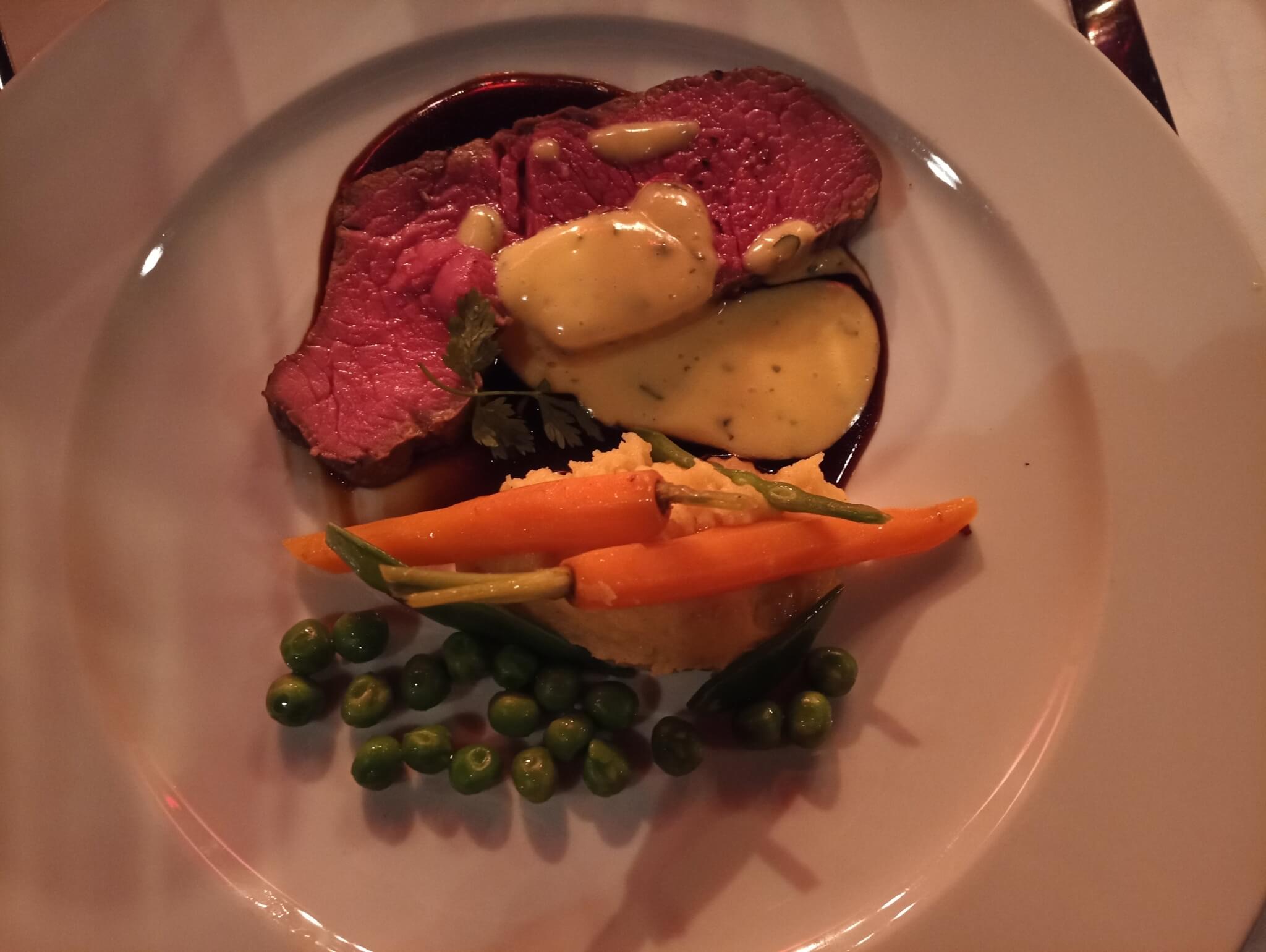 - Hauptgang: Rinderrücken mit Sauce bearnaise, glacierten karotten, Zuckererbsen und Stampferdäpfeln