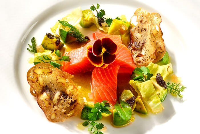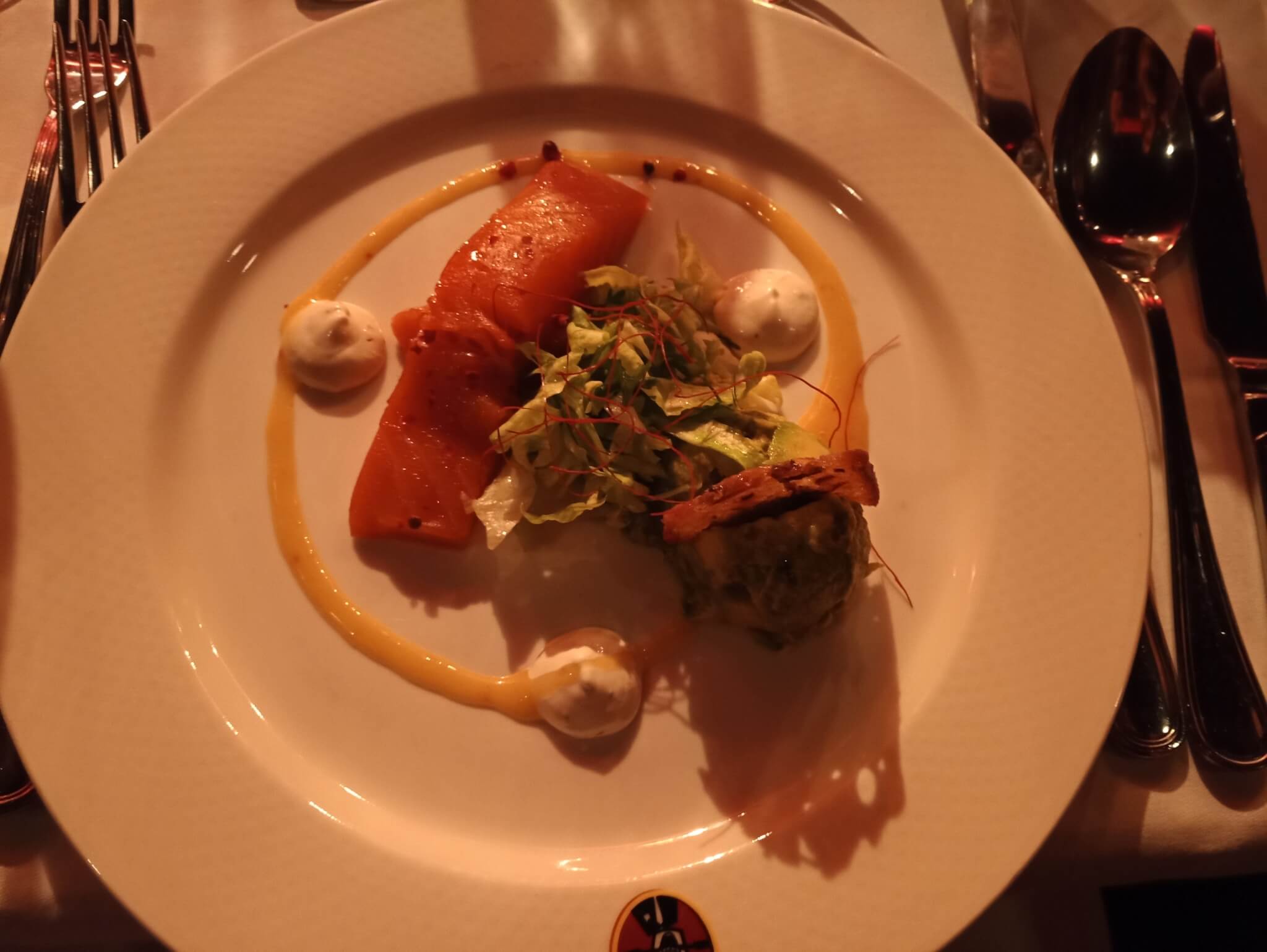 - Vorspeise: Tatar von Avocado und Limetten, gebeizter Saibling in Pfeffercreme mit Endiviensalat und Walnussöl