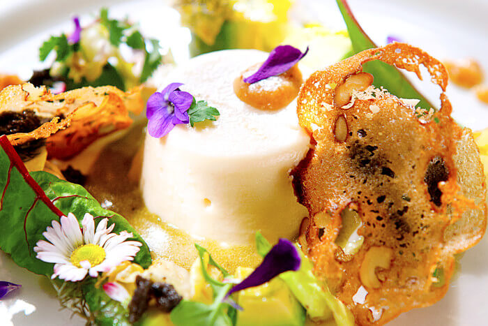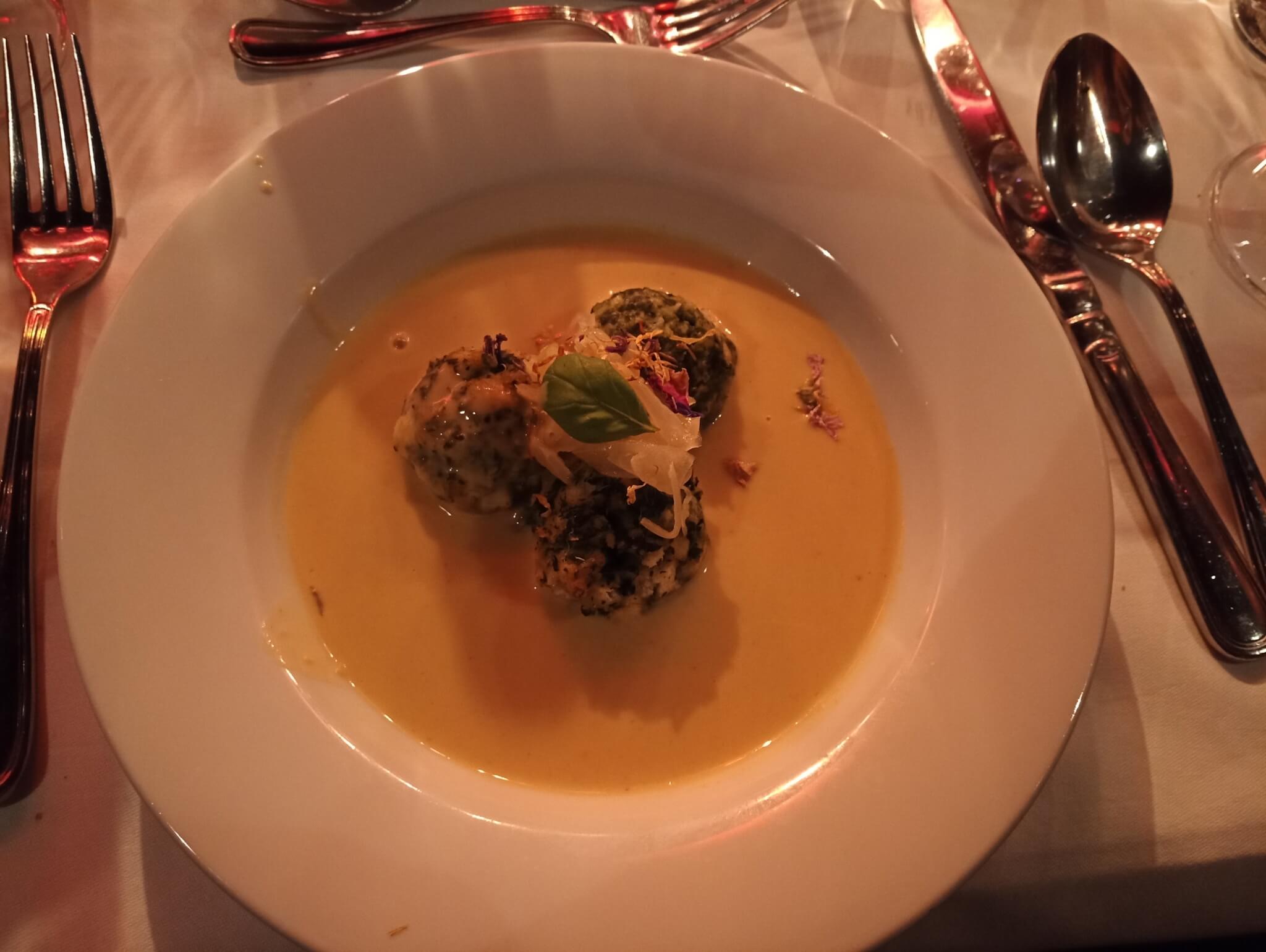 - Zwischengang: Weiße Zwiebelsuppe mit Spinatknödeln, Ringelblumen, Malven und Bergkräutern
