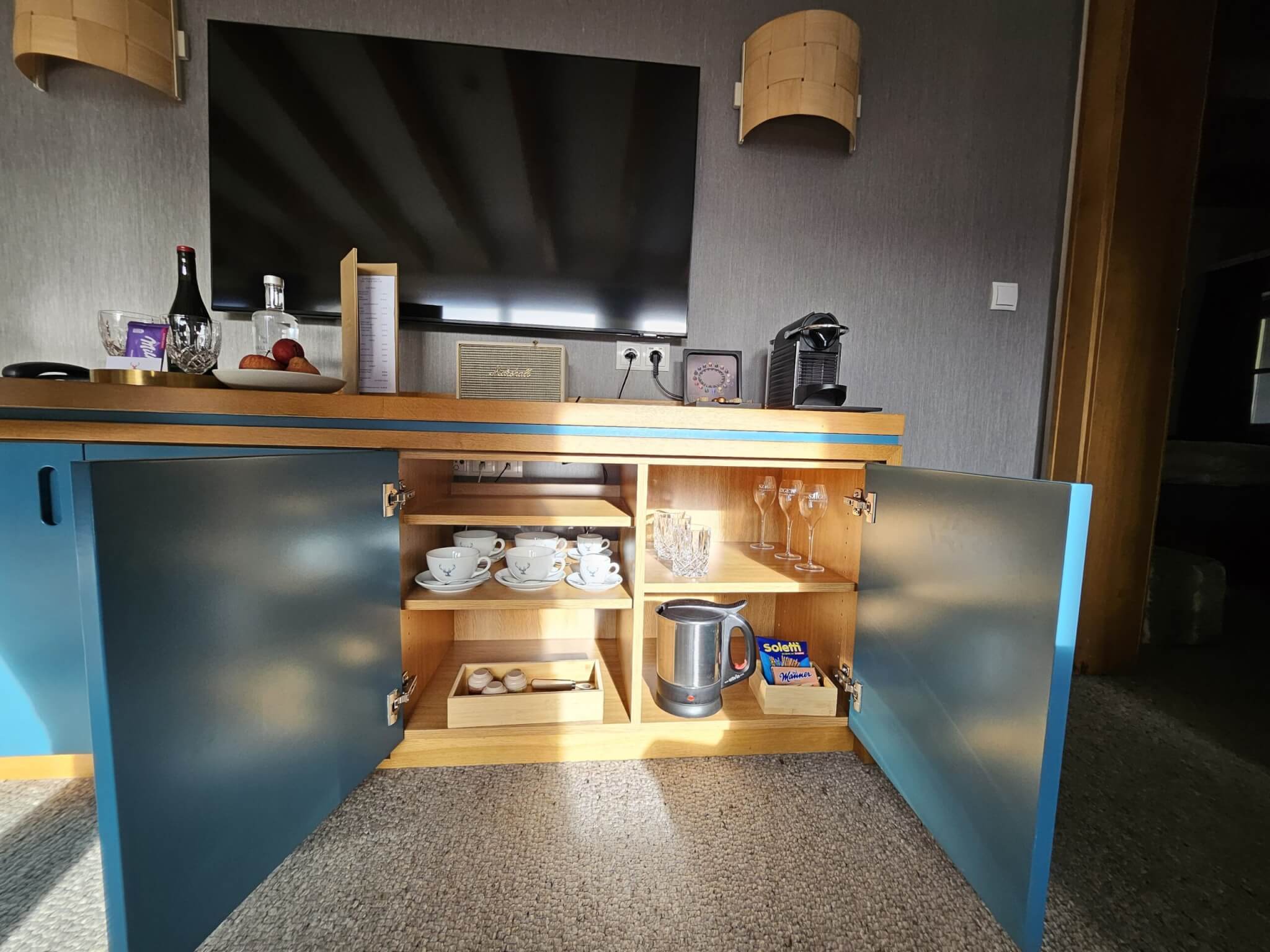 - Wohnlichkeit: Der getrennte Wohnbereich mit dem kuscheligen Sofa ist ideal, um den Abend bei einem Glas Wein Revue passieren zu lassen.