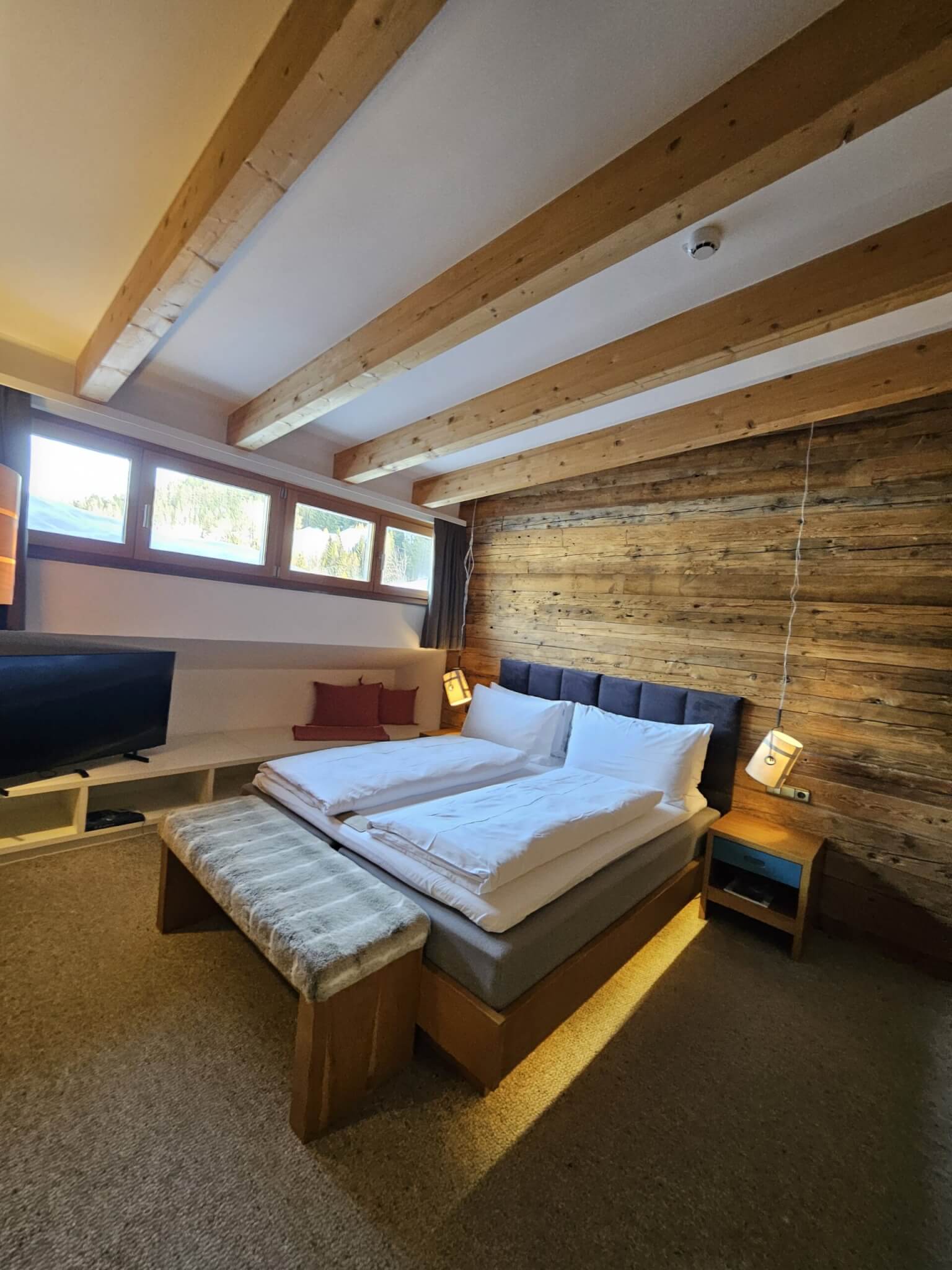 Mein Zimmer fühlte sich sofort wie ein Rückzugsort an. Großzügig geschnitten, mit einem Balkon, von dem aus ich direkt auf die winterliche Bergwelt blickte.