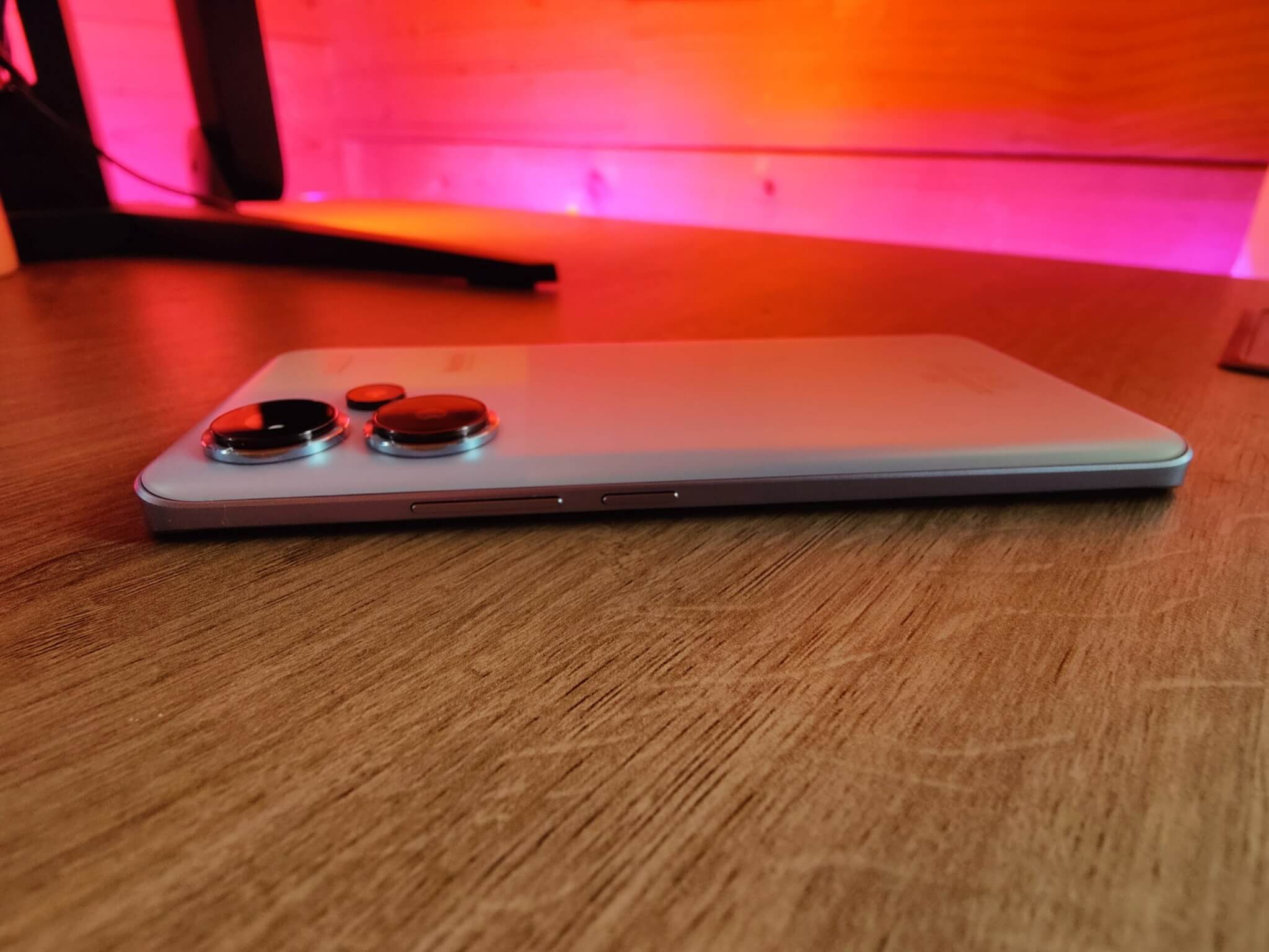 Auf der Rückseite ist die Kamera sehr präsent. Sie ragt mehrere Millimeter über das restliche Gehäuse hinaus, was zur Folge hat, dass das Xiaomi Redmi 13 Pro+ 5G nicht glatt auf dem Tisch liegt. Durch die einseitige Positionierung der Kamera würde es bei der Bedienung am Tisch wackeln. Aus diesem Grund verwende ich beim Xiaomi Redmi 13 Pro+ 5G gerne eine Hülle, die außerdem noch die Kamera schützt. Ein Smartphone ungeschützt auf die Kamera zu legen, fühlt sich für mich falsch an und ich kann mich der Sorge um Kratzer nicht erwehren. Die mitgelieferte Hülle hat eine Erhöhung rund um die Kamera und nimmt mir dankenswerterweise diese Sorge ab. Für das Spielen im Querformat empfinde ich aber die Haptik mit Hülle nicht so ideal, da die Erhöhung bei hitzigeren Spielen gerne bei den Fingern drückt. Daher nehme ich sie für ausgedehntere Gaming-Einheiten ab. Alternativ kann man sich auch Hüllen von Drittanbietern bedienen, die eine weniger starke Erhöhung rund um die Kamera haben. Diese Eigenschaft macht das gesamte Gerät aber dicker. Hier muss man als Benutzer wohl oder übel abwägen, ob schlank oder bequem für einen persönlich priorisiert wird.