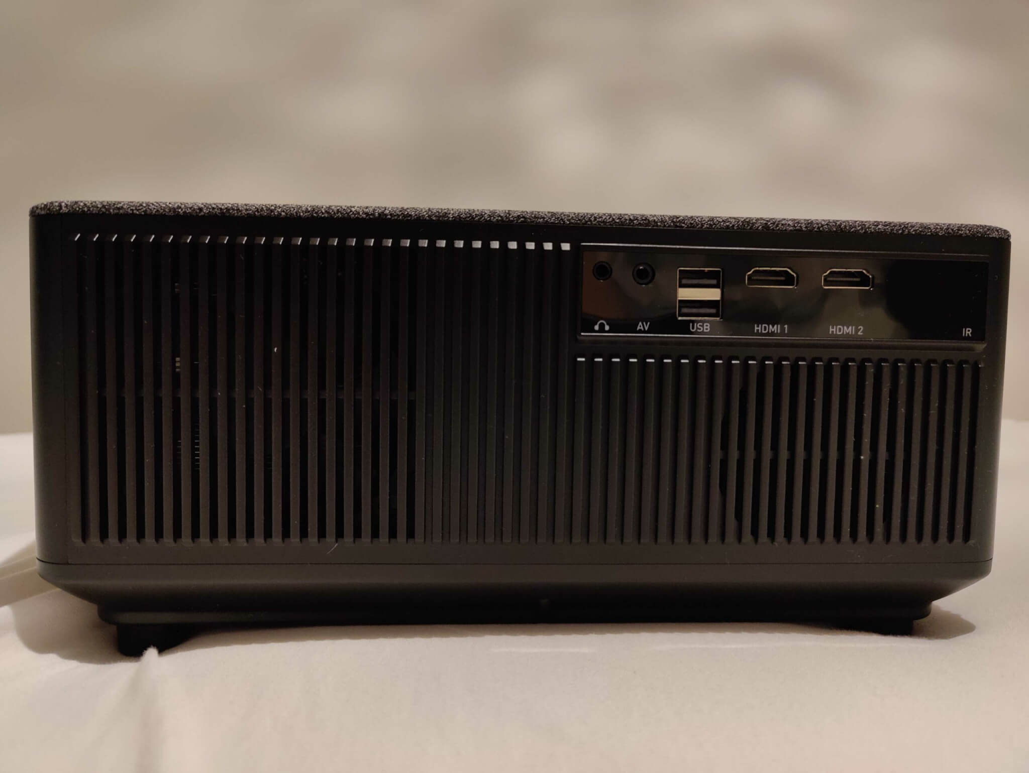 Der Karton wird vorsichtig geöffnet, das Zubehör aus der Schachtel genommen und schon kommt das Prachtstück – geschützt durch Schutzpolster auf beiden Seiten – zum Vorschein. Das Gute Stück (Abmessungen 30 cm x 25 cm x 14 cm) wird aus der Schachtel gezogen und gleich mal begutachtet. Gleich fällt die hochwertige Verarbeitung auf. Die obere Seite ist mit einem edlen Stoff (IPX5 Standard – Staubabweisend) überzogen, in den die On-Device-Bedienelemente schön eingearbeitet wurden. Auf der rechten Seite ist der Anschluss für die das Stromkabel, während auf der Rückseite die Anschlüsse für die Inputs (z.b. HDMI oder USB) sind. Auf der vorderen Seite ist – wie nicht anders bei einem Projektor zu erwarten – die Linse, die durch eine abnehmbare Abdeckung geschützt ist. In der Box enthalten sind – und das ist definitiv ein Pluspunkt – entsprechende Basiskabel (zb. HDMI). Auch eine Fernbedienung ist enthalten, doch die dafür notwendigen Batterien sind leider nicht im Paket dabei.