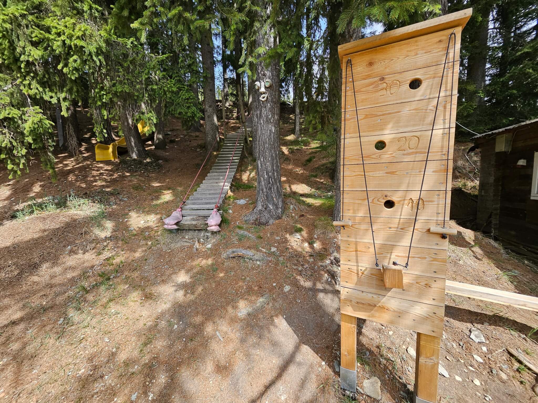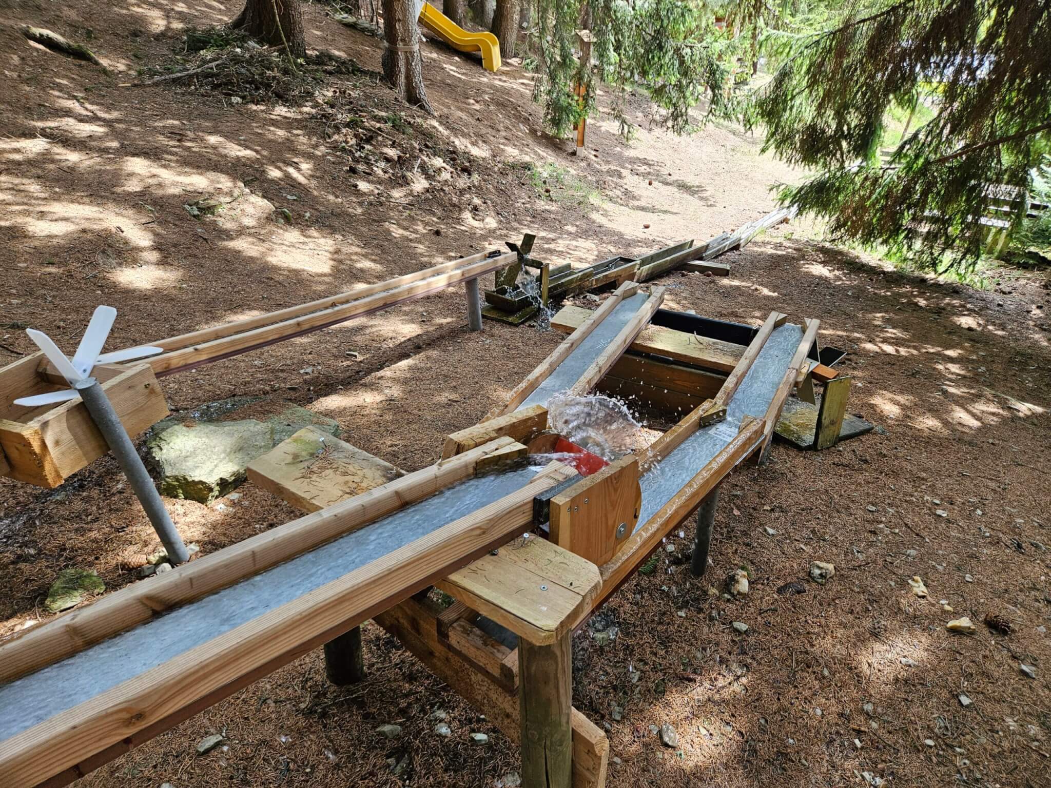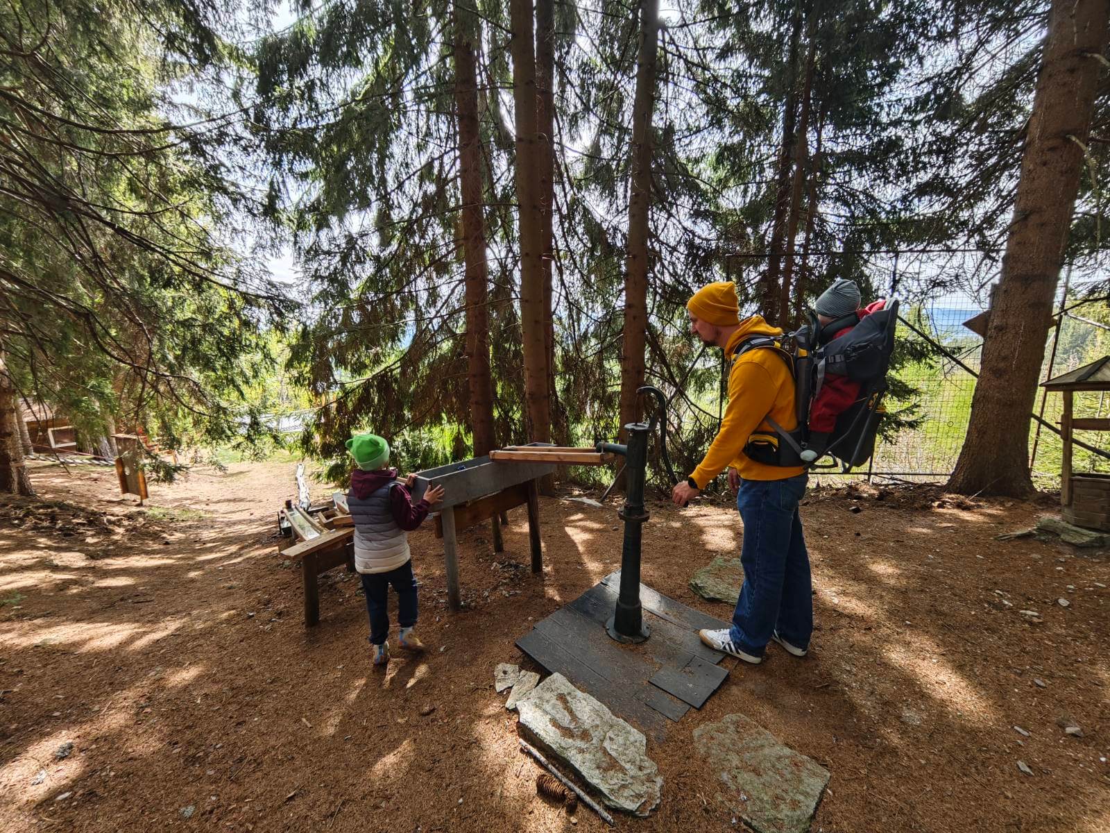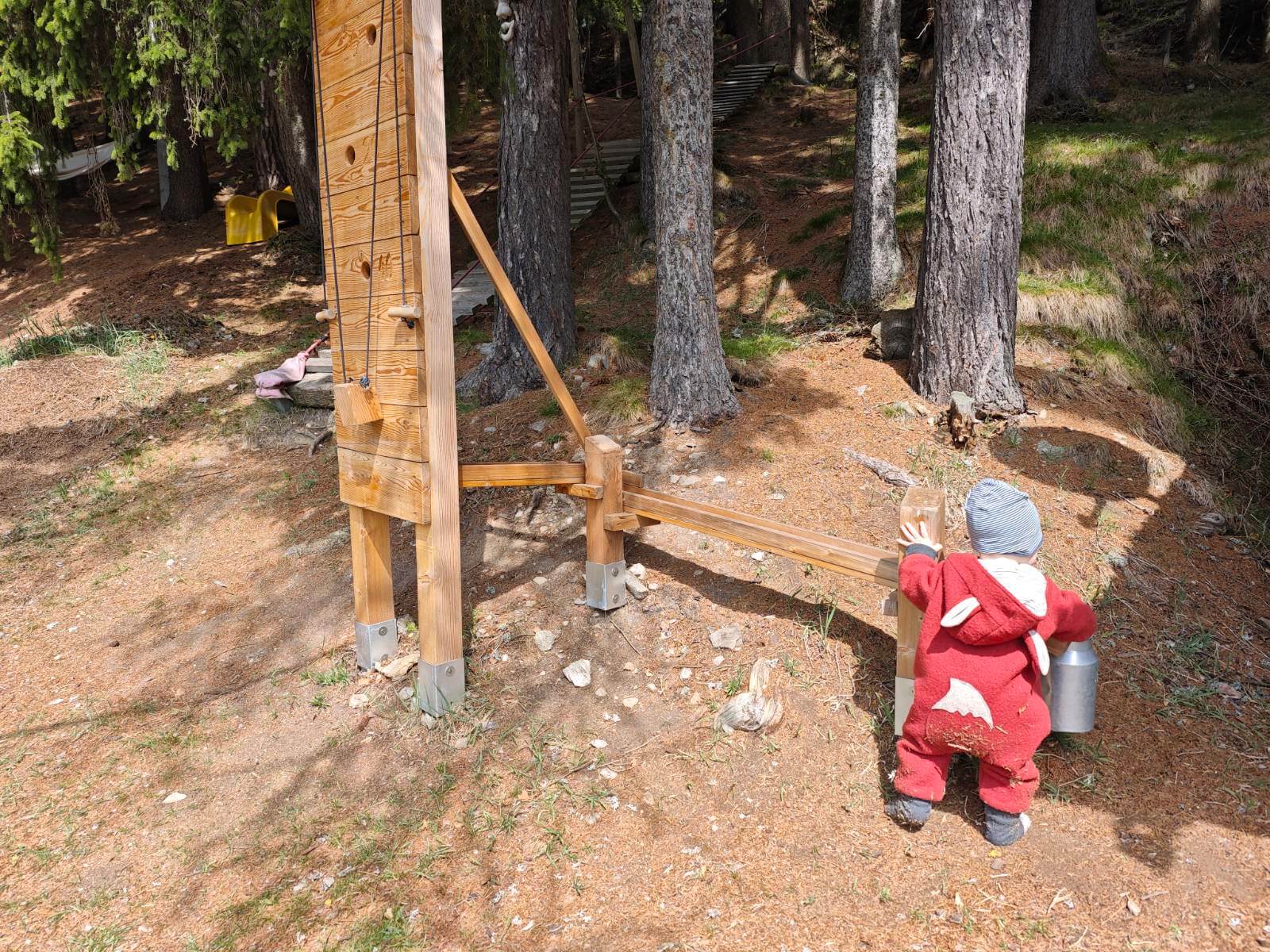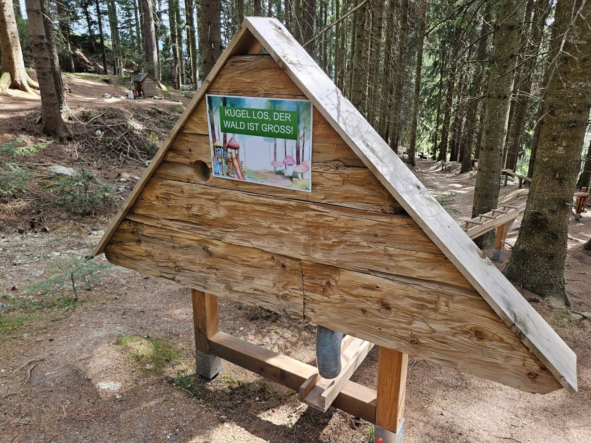 Doch die Märchenfiguren sind erst der Anfang, denn der Wald ist gespickt mit kreativen Stationen, die Kinderherzen höher schlagen lassen. Besonders beeindruckend sind die Holzkugelbahnen, die vom Chef des Hotels höchstpersönlich mit viel Herzblut gebaut und ständig erweitert werden. Es macht unglaublich viel Spaß, die Kugeln über die meterlangen Bahnen zu jagen, an verschiedensten Holzhindernissen, ja sogar an ein paar Bauarbeiterhelmen geht es vorbei. Eine ebenfalls tolle Idee war für uns die Wasserpumpstation, die exakt so aussieht wie die, die bei meinen Großeltern im Garten stand, um im Sommer die Blumen zu gießen. Hier können die Kinder nach Herzenslust Wasser in hölzerne Rinnen pumpen und beobachten, wie die unterschiedlichen Ströme mehrere Mühlräder nacheinander in Bewegung setzen. Noch dazu gibt es wacklige Holz- und Reifenbrücken und gespannte Seile, wo die Kinder durch den Wald balancieren können. Innerhalb eines überschaubaren Areals (das Waldstück ist noch größer und kann noch weiter erkundet werden), konnten wir einen gesamten Vormittag verbringen und immer neue Dinge entdecken .