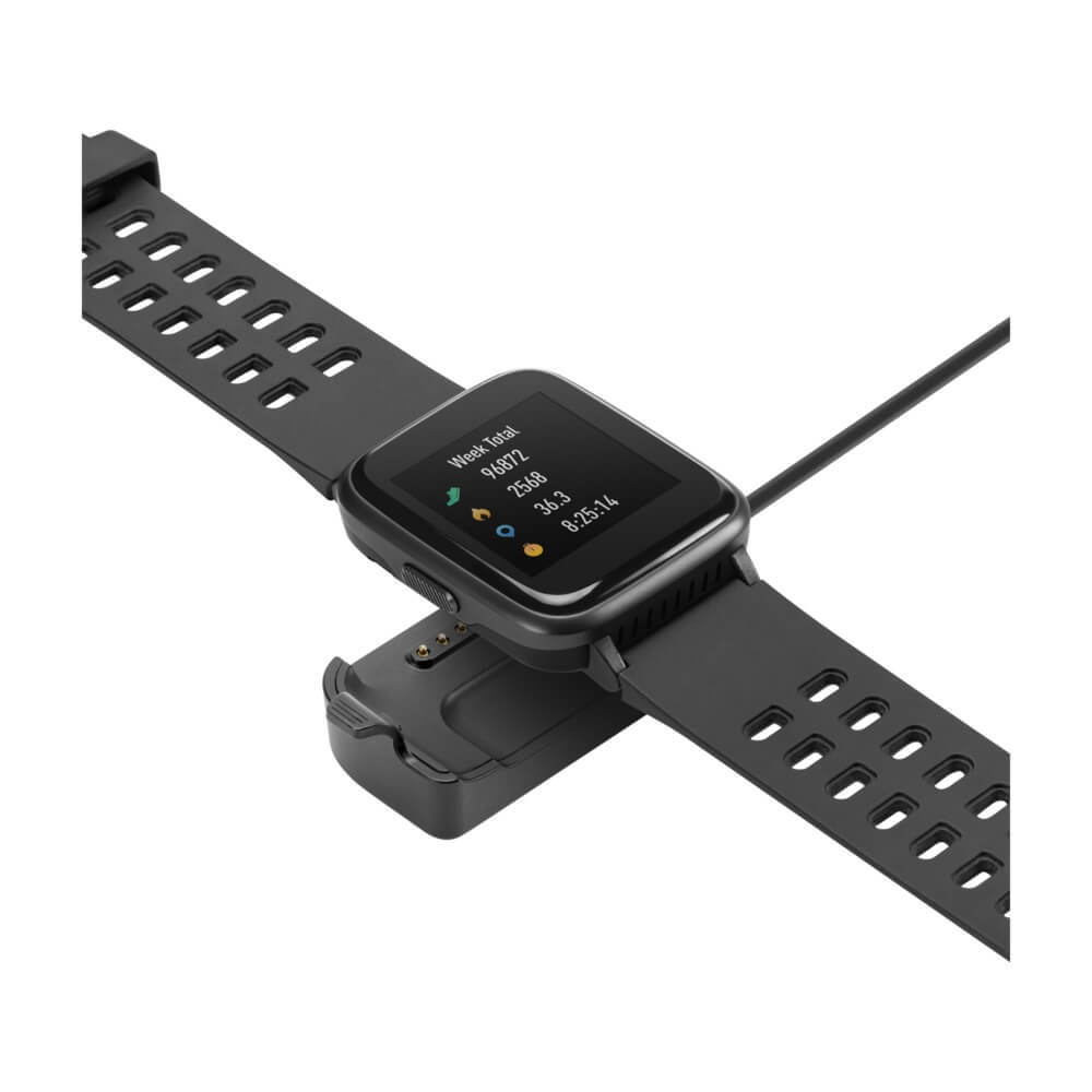 Beim Auspacken der SW202G fallen gleich einmal das 1,3 Zoll große Display, das sportliche Uhrenband sowie das geringe Gewicht von gerade mal 39 Gramm auf. Die Space Grau-Farbe ist rund um den Bildschirm und auf dem Gehäuse ersichtlich. Auf der Rückseite befindet sich eine Pin-Vorrichtung, die ihr dann verwendet, wenn es darum geht, die Smartwatch wieder aufzuladen. Die Klammer hält dann einerseits die Uhr fest, und andererseits drücken die Stifte des Ladegeräts gegen die Pins des Gerätes. Hier gibt es keine Magnete zur Arretierung, aber so oft müsst ihr die Uhr nicht laden. Mit der VeryFitPro-App wird die Uhr synchronisiert und ihr könnt Einstellungen vornehmen.