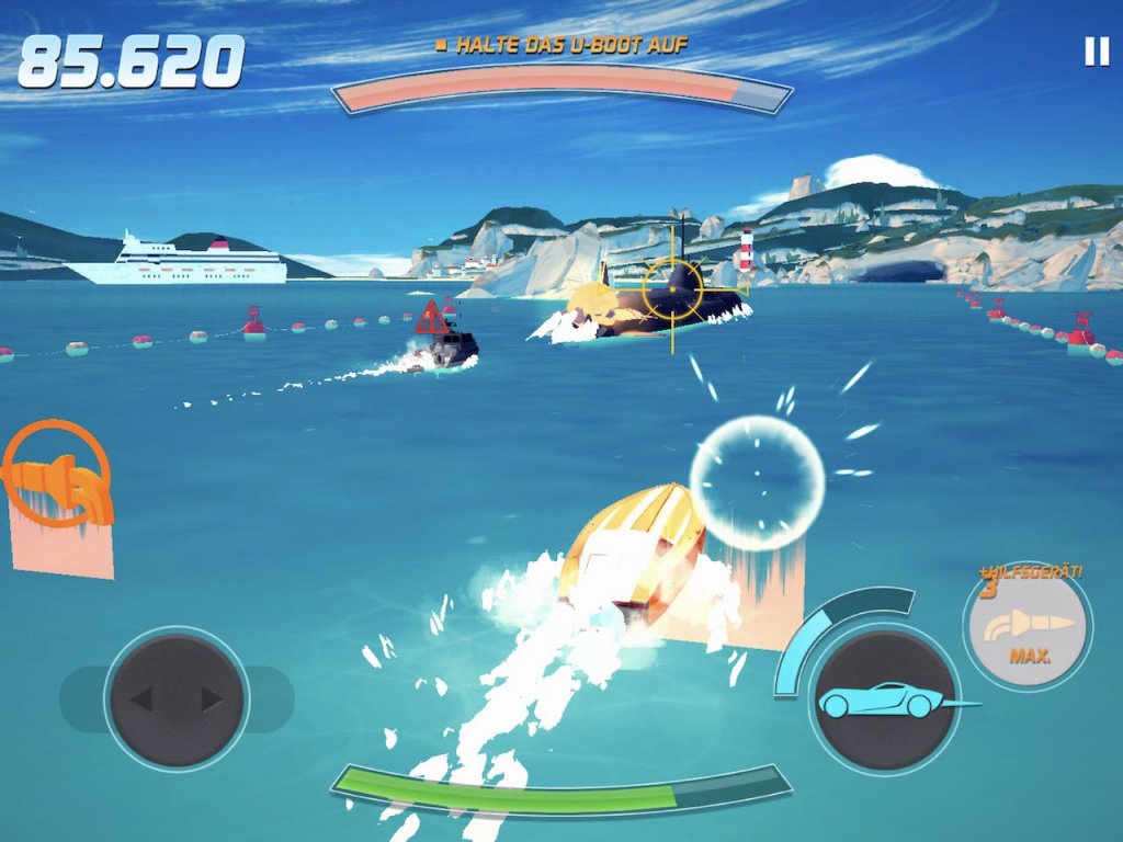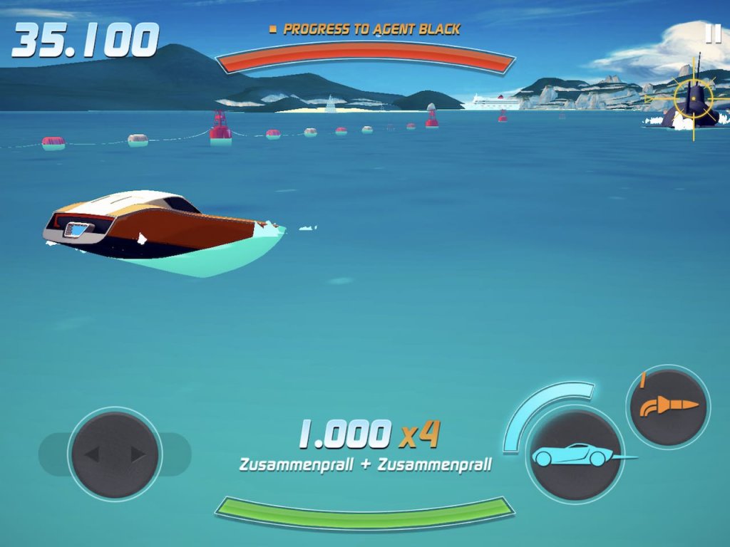 Dabei tut sich einiges in einem solchen Level: Ihr springt ganz Agenten-like über Hindernisse, weicht Minen aus, fahrt in einem Boot durch enge Kanäle und rammt dabei Kontrahenten, dass es eine Freude ist. Für Abwechslung ist gesorgt, da sich täglich die „aktuelle Krise“ ändert und ihr somit eine andere Mission spielen dürft. Diese lässt sich untertags aber beliebig wiederholen, falls ihr also einmal scheitern solltet, ist das absolut kein Problem. Agent Intercept wird am besten in kleinen Dosen gespielt, aber das über mehrere Tage hinweg!