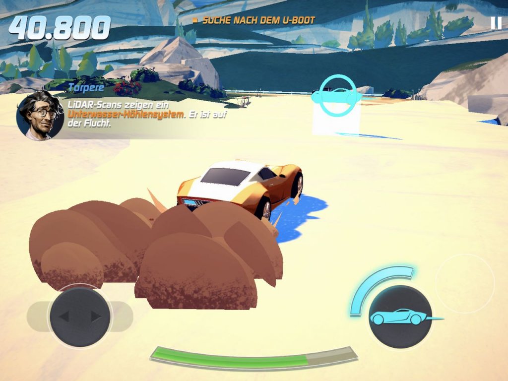 Auf der linken Seite des Touchscreens seht ihr einen virtuellen Analog-Stick, der sich nach links und rechts bewegen lässt. Damit lenkt ihr euer aktuelles Fahrzeug, und gegenüber befinden sich zwei Buttons. Mit dem einen löst ihr einen Geschwindigkeitsschub aus, bis der Turbo-Tank leer ist, und der andere Knopf ist für die Waffen zuständig. Das ist auch schon alles, was es zu Agent Intercept zu sagen gibt: Ihr fahrt mit eurer linken Hand die Strecke entlang und weicht Hinternissen aus, und die rechte ist für Turbo-Boosts und die Feuerkraft zuständig.