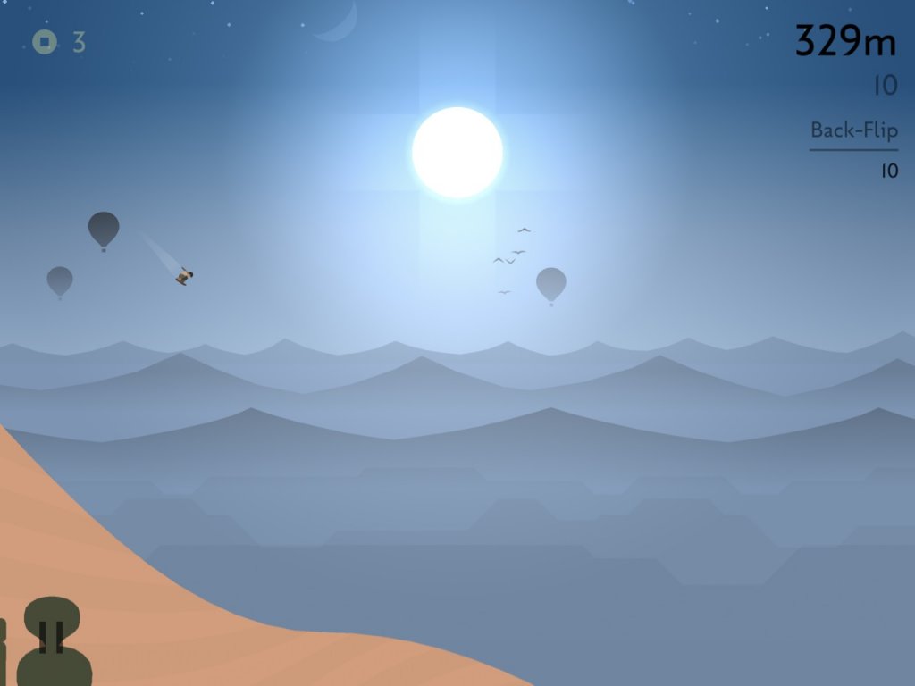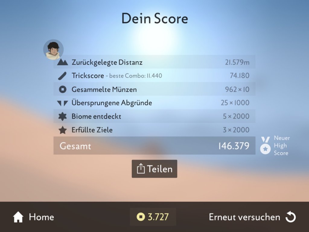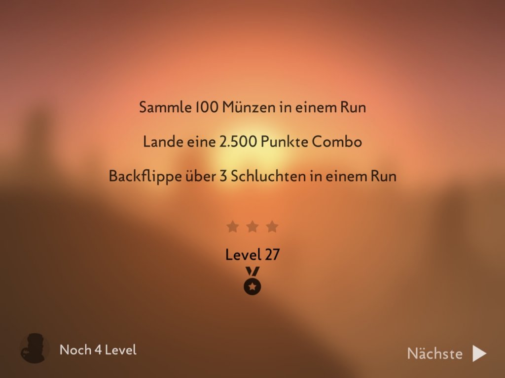 Zunächst beginnt alles noch sehr einfach. Ziele wie „Erreiche 500 Meter“ oder „Schaffe einen Backflip“ sind oft beim ersten Versuch geschafft. Doch langsam und stetig fängt euch das Game, und ehe ihr euch verseht, spielt ihr schon die zigste Runde des Spiels! Diesen Reiz kann man nur schwer kopieren. Nicht zuletzt deshalb hob ich das Game schon einmal hervor.