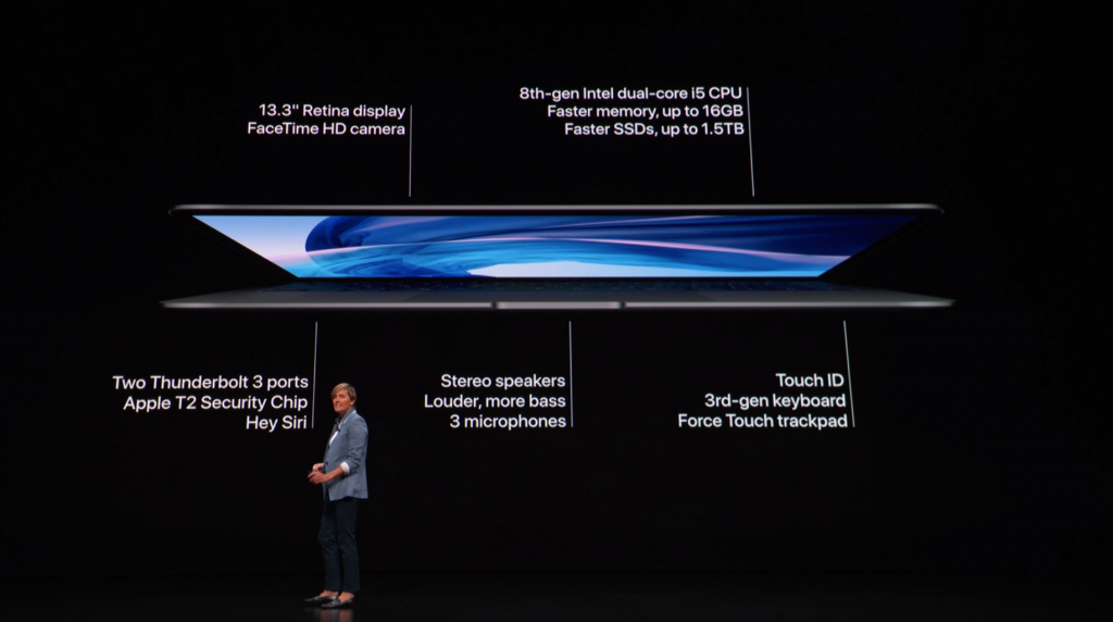 Das MacBook Air wurde komplett überarbeitet. Apple bezeichnet das Gerät als „absolut schön“ – vor allem, weil das Display nun ein hochauflösendes Retina Display bietet. Die kompletten Ränder sind weg, 13,3 Zoll hat der Bildschirm nun als Diagonale spendiert bekommen. 48 % mehr Farben können dargestellt werden, und Touch ID ist ebenfalls mit von der Partie!