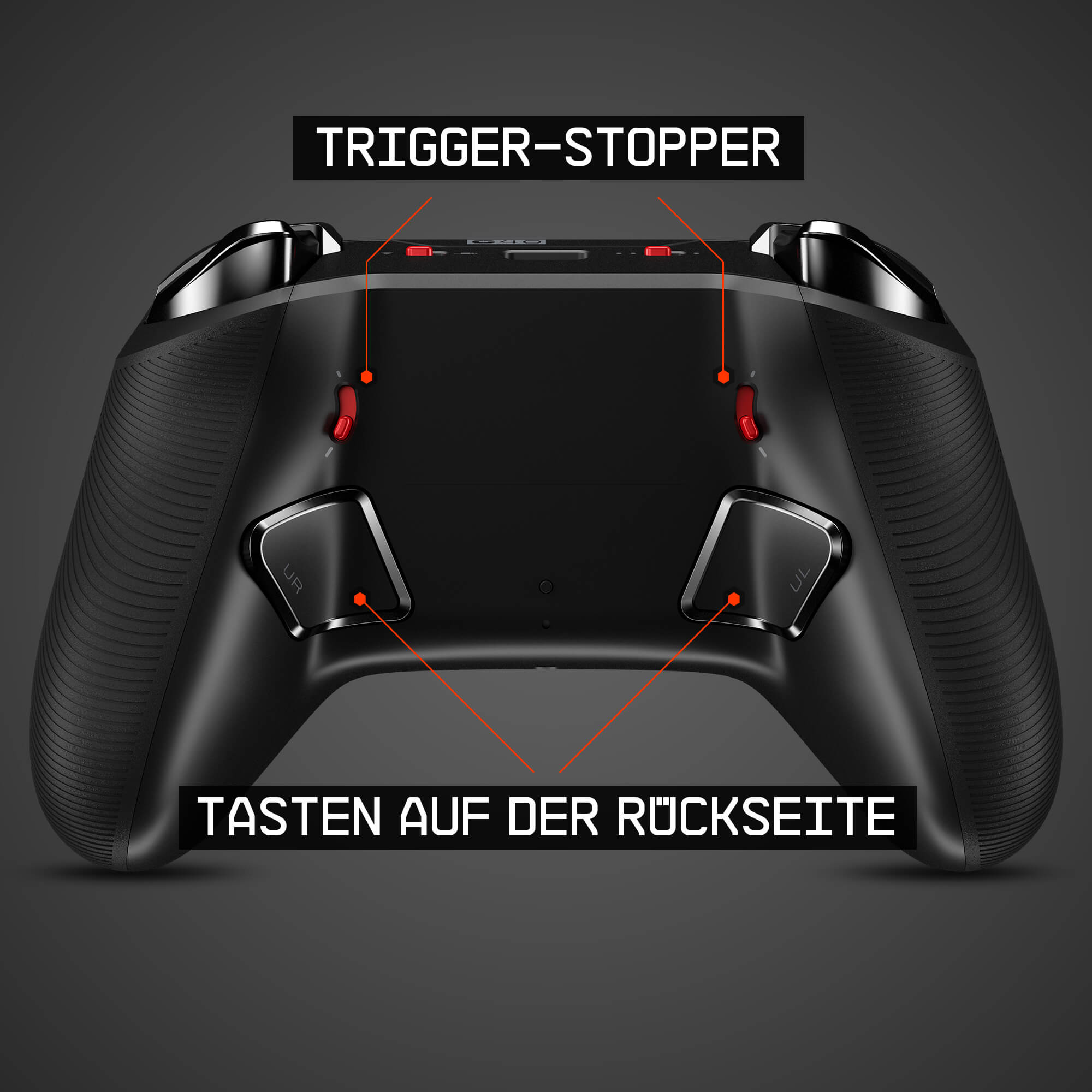 Die Steuereinheiten, also Thumbsticks, Digitalsteuerkreuz, sowie die vier Buttons weisen eine robuste Verarbeitung auf und greifen sich gut an. Die Schultertasten, wie auch die zwei Backpaddles haben einen sehr angenehmen Druckpunkt und besonders letztere sind gut gelegen und gut erreichbar. Die Trigger bieten einen der angenehmsten und präzisesten Widerstände, die ich jemals an einem Gamepad ertasten durfte, sogar noch besser als die des XBox One Pads, das dahingehend für mich bis dato die Referenz bildete.