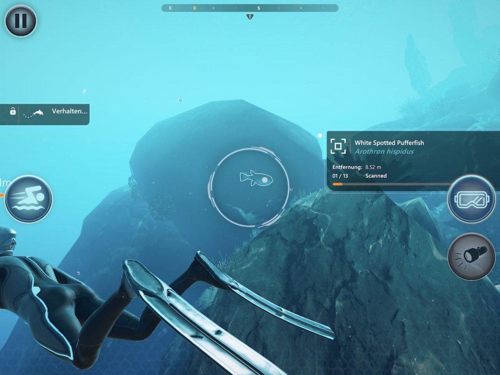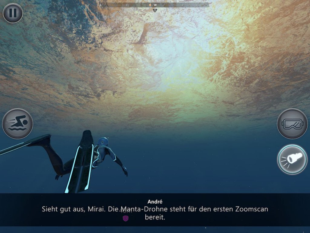 Eure Aufgabe im Spiel ist es nun, einerseits den gewaltigen Ozean zu erleben und andererseits für die Forschung wichtige Aufgaben zu erfüllen. Ein Scanner mit Zoomfunktion hilft euch bei der Identifikation von Tieren, aber auch bei der genaueren Erkennung von Walgesängen. Dazu steht euch eine Drohne zur Verfügung, die euch manchmal das Leben leichter macht, wenn ihr nicht gerade Seesterne untersucht oder mit Delfinen durch die Gegend schwimmt.