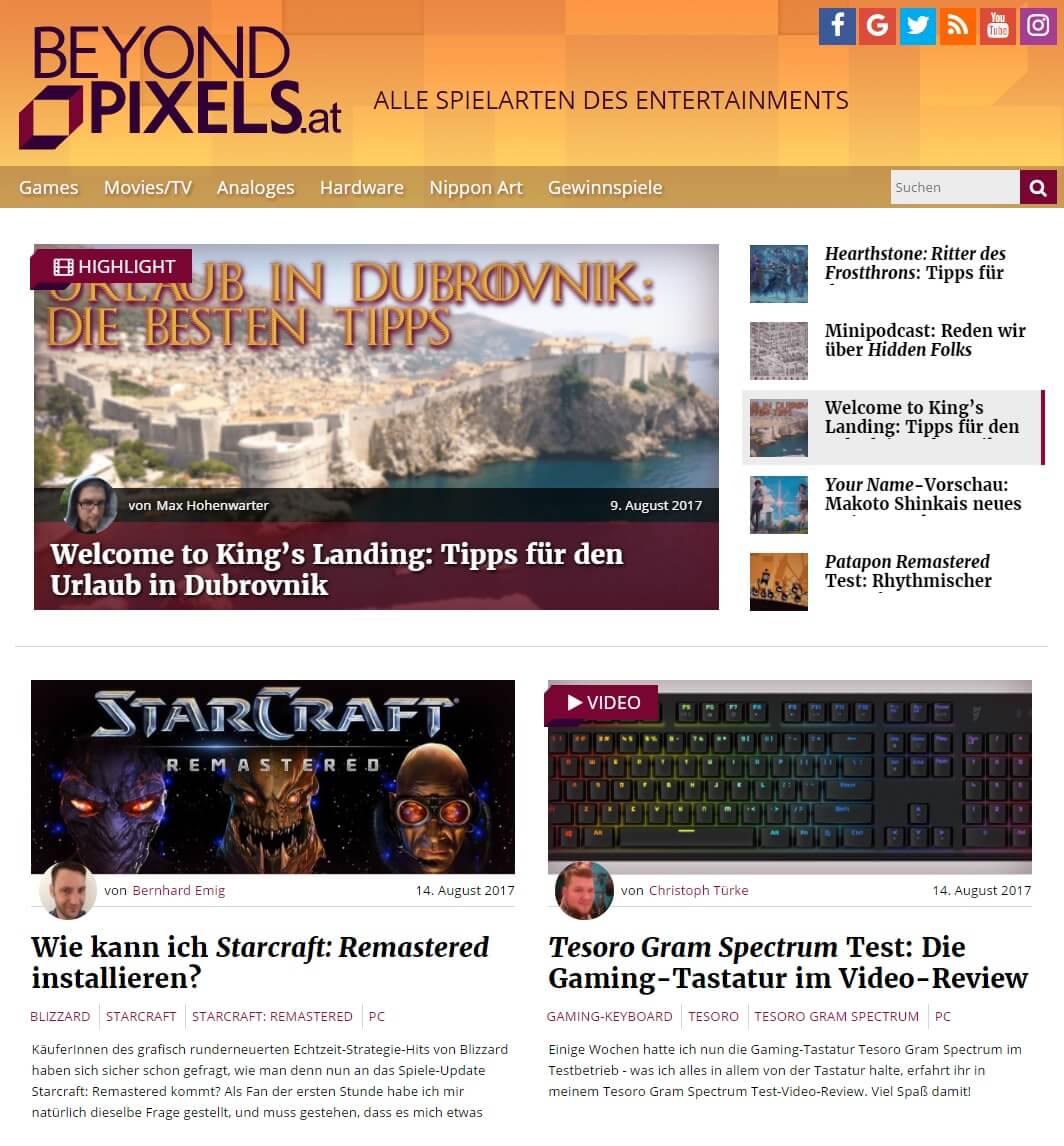 Nach einigen Stunden Konzept- bzw. Designarbeit sowie organisatorischem Kram (Backend aufsetzen, Theme aussuchen etc.) ging BeyondPixels.at online, und die ersten Berichte und Newsmeldungen erschienen auf unserem eigenen Portal. Was für ein gutes Gefühl! Das Thema CI und Logo war noch ungeklärt, aber immerhin konnten wir unser Hobby, das Verfassen von Beiträgen, bereits ausleben.