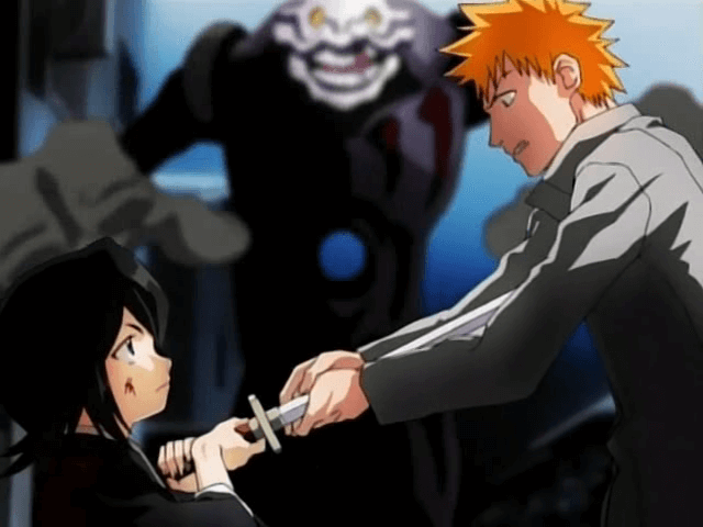Am selben Abend betritt diese Schwertkämpferin das Zimmer von Ichigo und spürt eine Gefahr, die näherkommt. Als plötzlich ein sogenannter Hollow (Anm.: ein gigantisches spirituelles Monster, dass von normalen Menschen nicht gesehen werden können) ein Loch in das Elternhaus von Ichigo reißt und seine zwei Schwestern in Lebensgefahr bringt. Ichigo fackelt nicht lange und greift den Hollow mit einem Klappstuhl an. Ohne Erfolg! Der Geist befördert ihn mit nur einem Faustschlag meterweit durch die Luft. Rukia, das Shingami-Mädchen mit der schwarzen Kutte, greift ein, und fügt dem Hollow mit ihrem Schwert eine tiefe Wunde am Arm zu. Das war allerdings zu wenig, um das Monster zu vertreiben. Es steuert zielstrebig auf Ichigo zu, doch Rukia wirft sich dazwischen und wird tödlich verletzt. Ist jetzt alles aus? Nein, es gibt noch eine letzte Möglichkeit, die Situation zu retten, doch dafür muss sich Ichigo von Rukia mit ihrem Soul-Reaper-Schwert durchbohren lassen. Er zögert nicht einen Augenblick und erscheint nach einem hellen Lichtblitz ebenfalls in schwarzer Kutte mit einem noch größeren Schwert, als jenem, das Rukia zuvor verwendet hat. Mit drei Schwerthieben schlägt er den Angreifer in die Flucht und von jenem verheißungsvollen Tag an, ist Ichigo ein Shinigami.