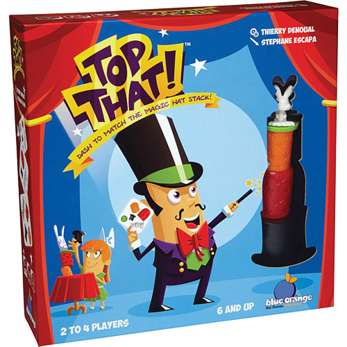 Bei Top That kommt es auf die schnellen Stapelkünste der Spieler an. Jeder Spieler nimmt sich ein Zauberset mit einem schwarzen Zylinder, einem roten Becher, einer orangenen Röhre, einer grünen Münze und einem weißen Hasen. Die Aufgabenkarten geben vor, wie die Gegenstände gestapelt werden müssen. Hier ist Schnelligkeit gefragt, denn grau dargestellte Gegenstände müssen in anderen Gegenständen versteckt werden. Wer die Aufgabe zuerst erfüllt, erhält die Aufgabenkarte. Wer zuerst fünf Karten sammelt, gewinnt das Spiel und wird zum besten Showzauberer des Abends gekürt. Top That von Thierry Denoual ist ein Aktionsspiel für zwei bis vier Spieler ab sechs Jahren.