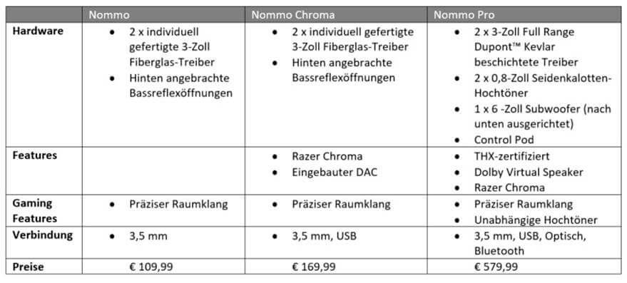 Der Razer Nommo ist ab sofort im Razer-Store und noch im ersten Quartal im Handel für 109,99 Euro erhältlich. Für den Nommo Chroma gilt es bei gleicher Verfügbarkeit 169,99 Euro zu berappen. Und der Nommo Pro kommt auf stolze 579,99 Euro, während hier der genaue Release-Termin noch bekannt gegeben wird.