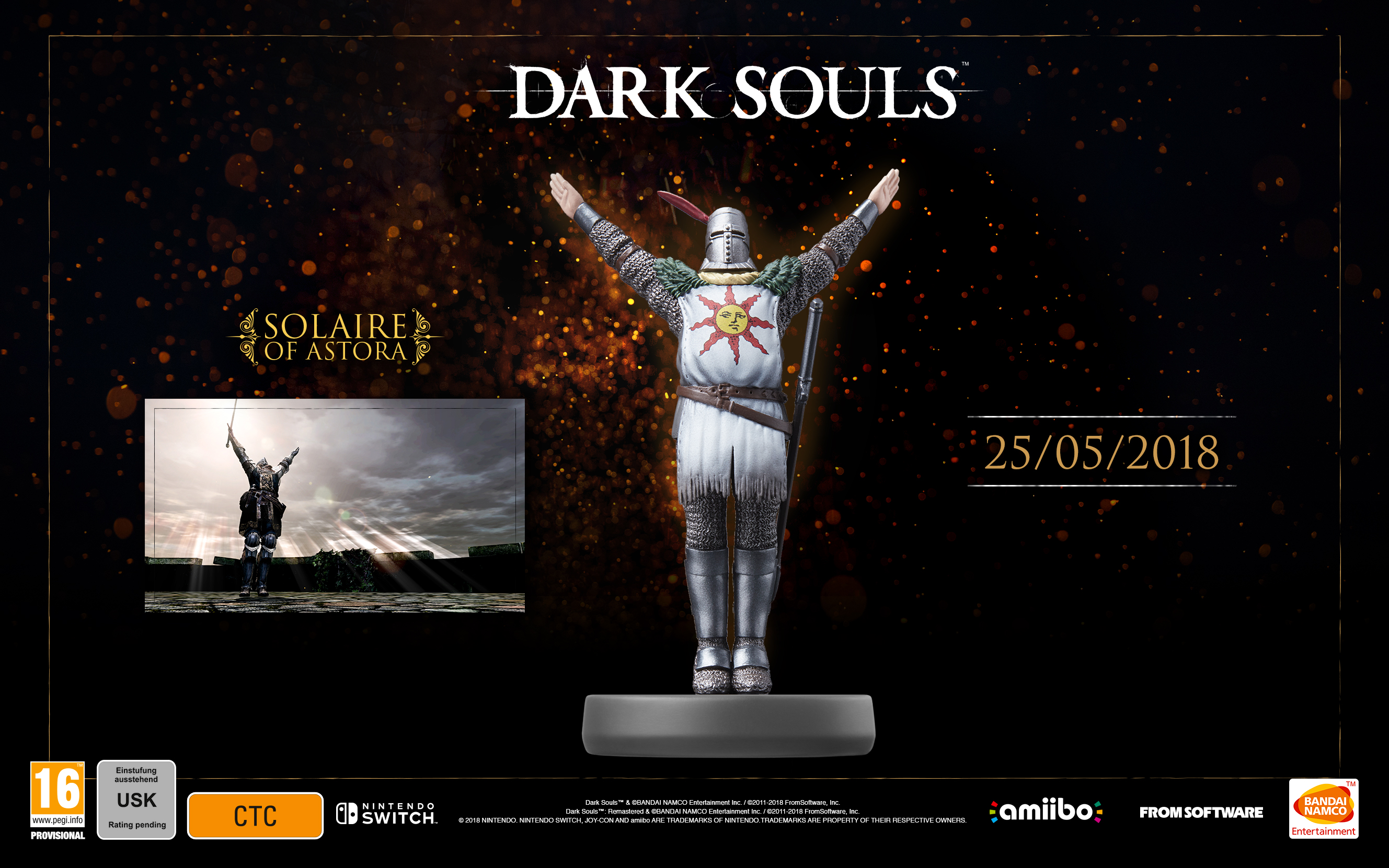 „It’s time to praise the sun“ – Bandai Namco kündigte nun an, dass zeitgleich mit der Veröffentlichung von Dark Souls Remastered am 25. Mai 2018 ein Solaire von Astora-amiibo erscheinen wird. Durch die Verwendung des amiibo könnt ihr die “Praise the Sun”-Geste, die ebenfalls auch im regulären Spielverlauf freigeschaltet werden kann, gleich zu Beginn des Spiels verwenden. Des Weiteren könnt ihr noch vor der Veröffentlichung von Dark Souls Remastered im Rahmen eines “Network Tests” auf Nintendo Switch, PS4 und Xbox One einen Teil des Spiels kostenlos herunterladen, um es samt Online-Features zu testen. Weitere Details zum “Network Test” folgen bald.