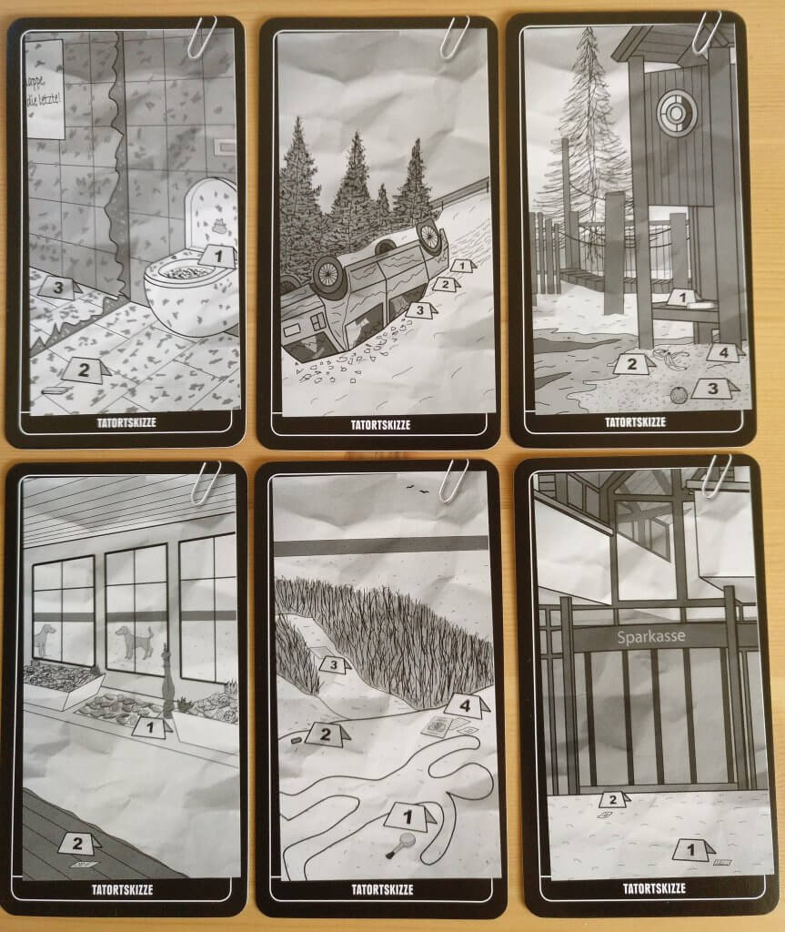Weniger Positives gibt es über die grafische Gestaltung des Spiels zu sagen. Während die Komponenten selbt in Papier- und Druckqualität keine Wünsche offen lassen, sind die Tatortskizzen auf den Fallkarten schlichtweg hässlich. Deren Vorderseiten sowie die Gestaltung der Lösungskarten sind zweckmäßig, wenn auch nicht mehr. Hier hätte ich mir eine deutliche Verbesserung gegenüber des Vorgängers gewünscht.