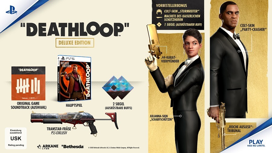 Ab sofort können die Deathloop Standard Edition für 69,99€* (59,99€* für PC) und die Deathloop Deluxe Edition für 89,99€* (79,99€* für PC) im PlayStation Store und für PC via Bethesda.net-Launcher (Steam-Vorbestellungen folgen in Kürze!) vorbestellt werden. Diese Versionen enthalten die folgenden Ingame-Boni: