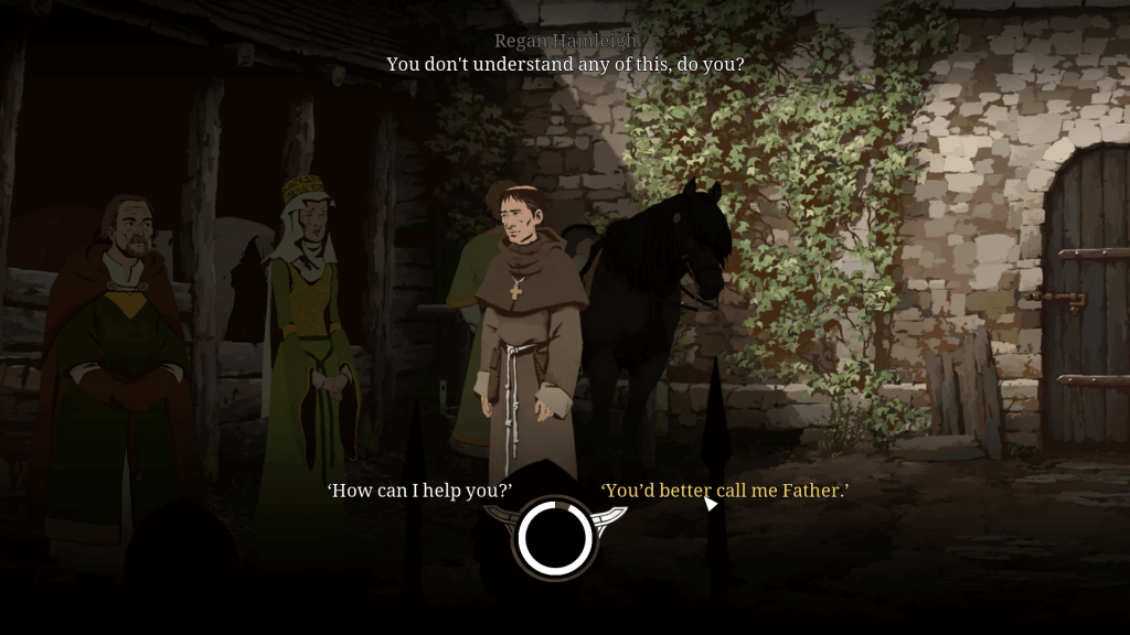 Doch Die Säulen der Erde will sowieso nicht mit Gameplay, sondern mit seiner Geschichte überzeugen. Wie eine Autorin des Spiels, Valentina Tamer, selbst in einer Präsentation auf der Respawn in Köln meinte: Das ganze Spiel soll zur Handlung und Immersion in dieser beitragen. Auch das Gameplay soll umfassend als erzählendes Element genutzt werden. Dieses Vorhaben ist meiner Meinung nach gut gelungen: Fällt ein Minispiel bei dem schnelle Reaktion gefragt ist, besonders leicht aus, wird dadurch unterstrichen, dass auch der Spielcharakter keine Probleme mit dieser Aufgabe hat. Oder auch die zur Auswahl stehenden Antworten in Dialogen sagen bereits viel über den spielbaren Charakter aus.