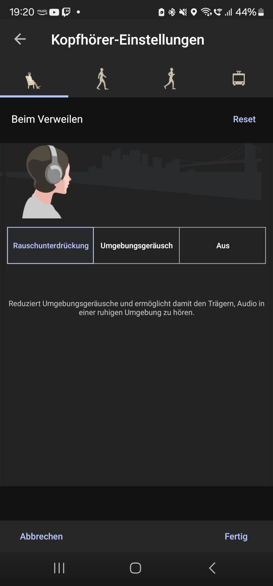 Das NC könnt ihr in 20 Stufen fein justieren und auch die adaptive Rauschunterdrückung, die sich flexibel dem Umweltlärm anpasst zu-, abschalten. Außerdem ist es auch beim ANC möglich gewisse Szenarien zu bestimmen, je nachdem, ob ihr verweilt, gemütlich schlendert, lauft oder euch in öffentlichen Verkehrsmitteln bewegt, der XM6 regelt.