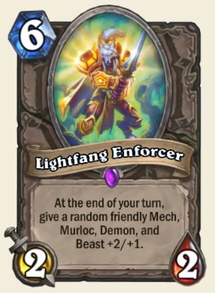 Es gibt hier zwei Minions, die ich euch ans Herz lege, sind Lightfang Enforcer (gibt je einem Dämon, Murloc, Mech und Wildtier am Ende des Zuges +2/+1) und Iron Sensei (gibt einem Mech am Ende des Zuges +2/+2). Mit diesen Minions könnt ihr euer Deck langfristig extrem verstärken. Das macht allerdings nur Sinn, wenn ihr genügend Minions auf die diese Effekte zutreffen am Bord habt (z.B. Hydra + Mech + ein Dämon oder Murloc mit Gift), da ihr sonst einen der so wichtigen Bordplätze verschwendet. Hier hilft auch Brann Bronzebeard, da er alle Kampfschreie zweimal auslöst, doch wie auch für die Buff-Minions dürft ihr nicht übersehen, wann ihr diese Minions gegen andere austauscht, weil der Bordspot mehr bringt, als das Buffen/Runde.