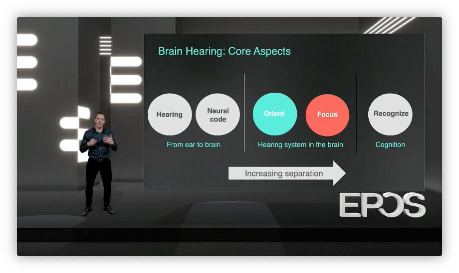 Jesper Koch (VP bei EPOS) erklärte, wie das Gehirn Schall und Geräusche überhaupt wahrnimmt. Wie wichtig perfekte Klangwiedergabe und das Mikrofon ist, was das mit der Kommunikation im Allgemeinen zu tun hat, welche Rolle euer Ohr dabei spielt und mehr – all dies wurde in den nächsten Minuten erklärt und umrissen, eine Q&A-Session folgte sogleich.