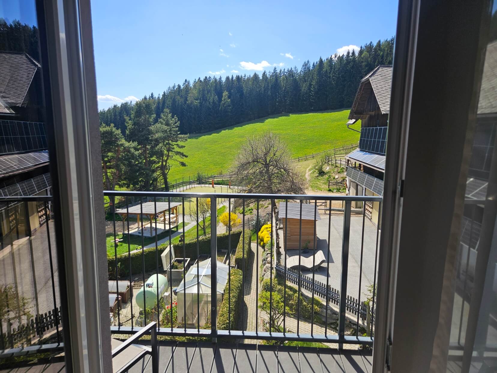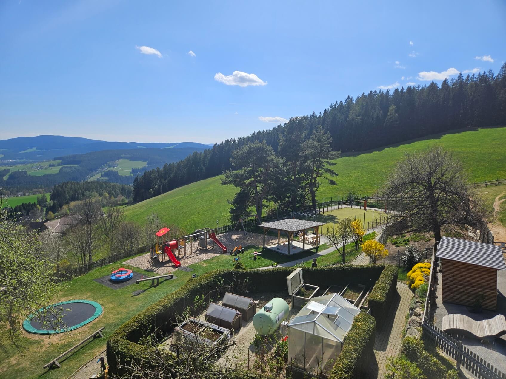 Nachdem wir uns im Zimmer eingerichtet hatten, zog es uns bei strahlendem Sonnenschein und einem tiefblauen Himmel sofort nach draußen, um den weitläufigen Außenbereich zu erkunden. Der Spielplatz war und ist ein tolles Erlebnis für beide unsere Kinder. Zwischen Klettertürmen, rasanten Rutschen, einem großen Trampolin und verschiedenen Schaukeln konnten sie sich so richtig austoben, während sie im Sandkasten versunken sind. Besonders schön für uns Eltern, überall auf dem Gelände sind liebevoll platzierte Bänke verteilt. So konnten wir entspannt Platz nehmen und den fantastischen Weitblick ins Tal genießen, während wir die Kleinen immer im Blick hatten.