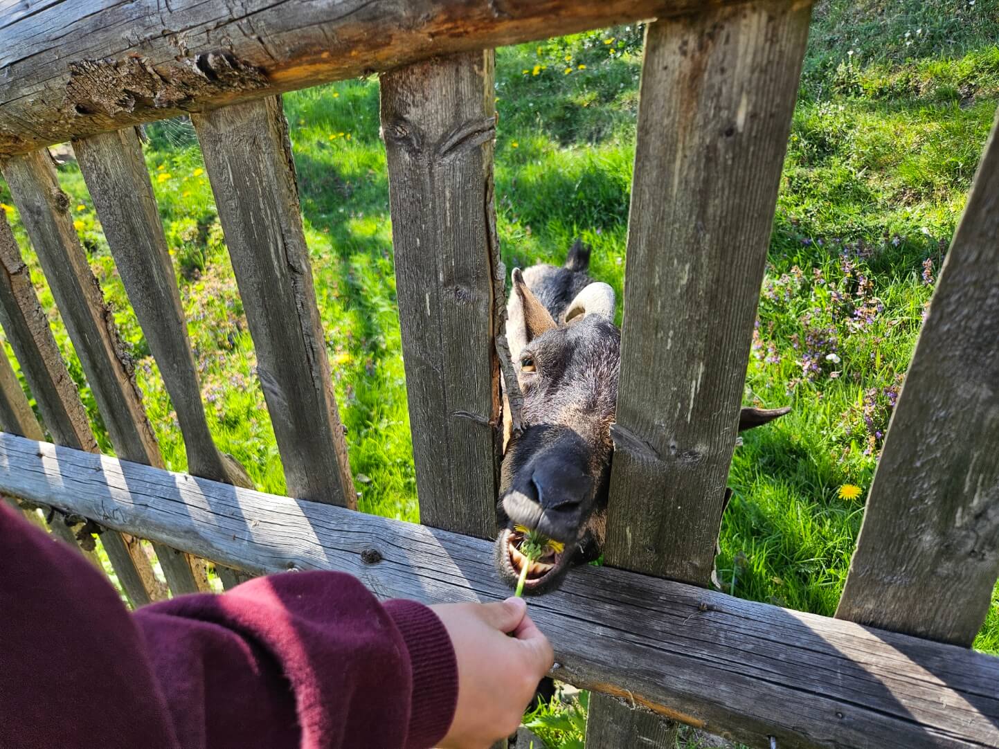 Ein absolutes Highlight war außerdem der hoteleigene Hof mit seinen Tieren, die ins Spielplatzgelände bzw. den Hof integriert sind. Bevor wir darauf näher eingehen, muss ich abermals ein durchdachtes Detail loben. Das gesamte Gelände ist eingezäunt, sprich die Kinder können überall hin, jedoch nicht auf die Straße oder in den Wald, ohne das wir es mitbekommen. Die Kinder waren sofort verliebt in die flauschigen Hasen und haben eine wirklich sehr kinderliebe Ziege gefüttert, die sich über Löwenzahn und Gras gefreut hat. Auch die Ponys standen hoch im Kurs und wurden ausgiebig bestaunt. Die wohl charmanteste Idee des Hotels ist aber das Erlebnis bei den Hühnern.
