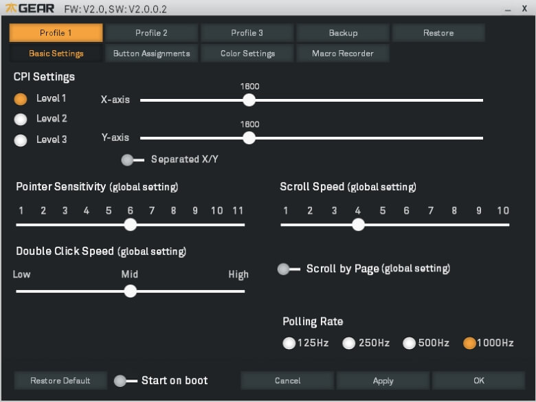 Hinter der ansprechenden Fassade und den Tasten befindet sich das technische Herz der Fnatic Gear Clutch. Das zwar auch ohne eine gesonderte Software schlägt, mit ebendieser aber erst seinen optimalen Pulsschlag erreicht. Mit dem herunterladbaren Tool lässt sich die Gaming-Maus vielfältig individualisieren. Ihr könnt hier drei verschiedene Profile anlegen, zwischen denen mit den Mitteltasten gewechselt werden kann. Die Beleuchtung lässt sich hier ebenso individualisieren wie Scroll-Geschwindigkeit oder Doppelklick-Tempo.