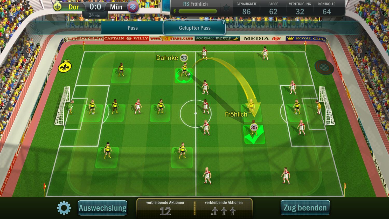 Aber genug der Lizenzen für Fußballfans, wie mich. Auch wenn ihr mit den Begriffen „falsche Neun“, „Doppelsechs“ oder „4-3-3“ nichts anzufangen wisst, werdet ihr mit Football, Tactics & Glory trotzdem Spaß haben, denn das Spielprinzip erinnert an XCOM. Egal ob der Gegner gerade den Ball hat oder ihr, pro Zug habt ihr drei Aktionen. Damit gemeint ist z.B. Laufen (mit oder ohne Ball), ein Tackling oder ein Torschuss. Ob eine Aktion gelingt, liegt an den Statuswerten der Spieler. Genauigkeit (für Schüsse), Pass, Verteidigung (für Tacklings und Grätschen) und Kontrolle (um den Ball zu behaupten). Die Anzahl des Statuswertes ist auch gleichzeitig der höchste mögliche Wert, der erwürfelt werden kann.