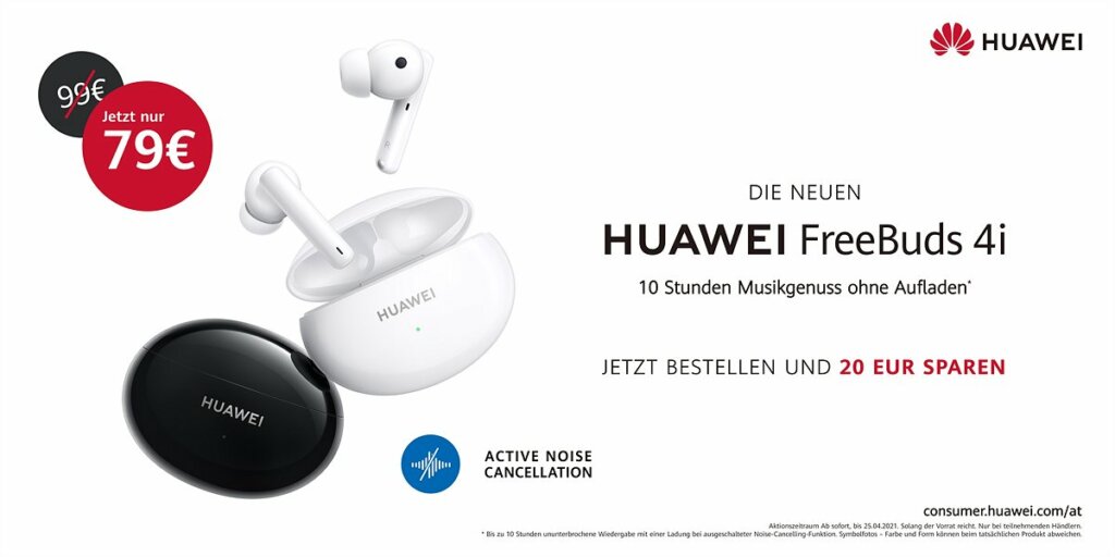 Huawei erweitert das In-ears-Portfolio um die FreeBuds 4i, die ab sofort in Österreich in den Farben Ceramic White und Carbon Crystal Black erhältlich sind. Die Huawei FreeBuds 4i bestechen durch ihr schlichtes und elegantes Design, die besonders starke Akkuleistung, die glasklare Audioqualität und die intelligente Geräuschunterdrückung Active Noise Cancellation (ANC). Ab sofort bis zum Ende des Aktionszeitraums am 25.04.2021 gibt es die In-Ear Kopfhörer bei teilnehmenden Handelspartnern um 79 Euro.*