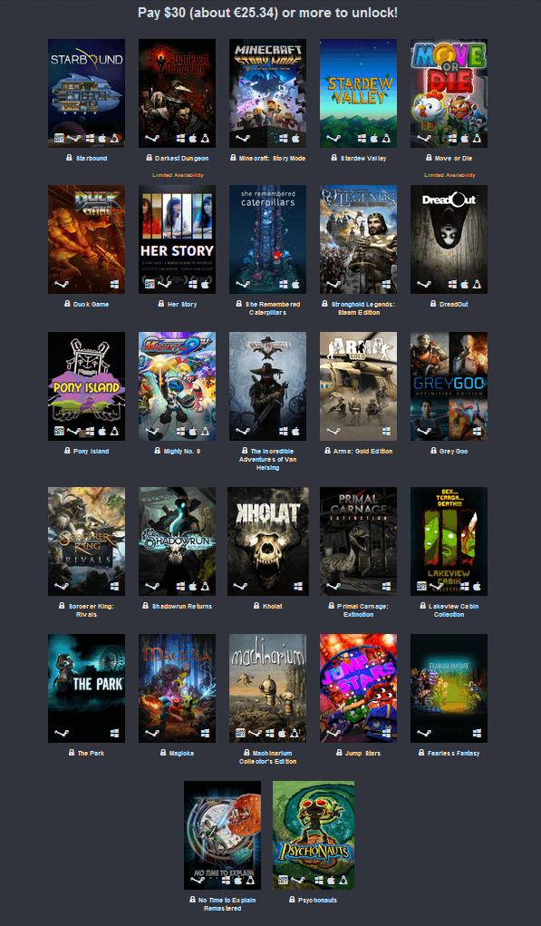 Meiner Meinung nach hat man eine sehr gute Mischung gefunden: Mit Spielen wie Starbound, Stardew Valley oder Darkest Dungeons kann man alleine schon Hunderte Stunden verbringen. Mit Pony Island und Her Story erhält man im Vergleich dazu zwar kurze, aber absolut einzigartige Spielerlebnisse, die einen über den Tellerrand üblicher Genres blicken lassen. Mit z.B. Magicka oder einem meiner persönlichen Alltimefavorites Move or Die, könnt ihr euch mit bis zu vier SpielerInnen auf einen vergnüglichen Partyabend auf der Couch freuen. Ich kann dieses Bundle daher nur wärmstens empfehlen. Für genau 25,34 € erhaltet ihr unzählige Stunden Spielspaß. Die Aktion läuft noch bis zum 21. November 20:00.
