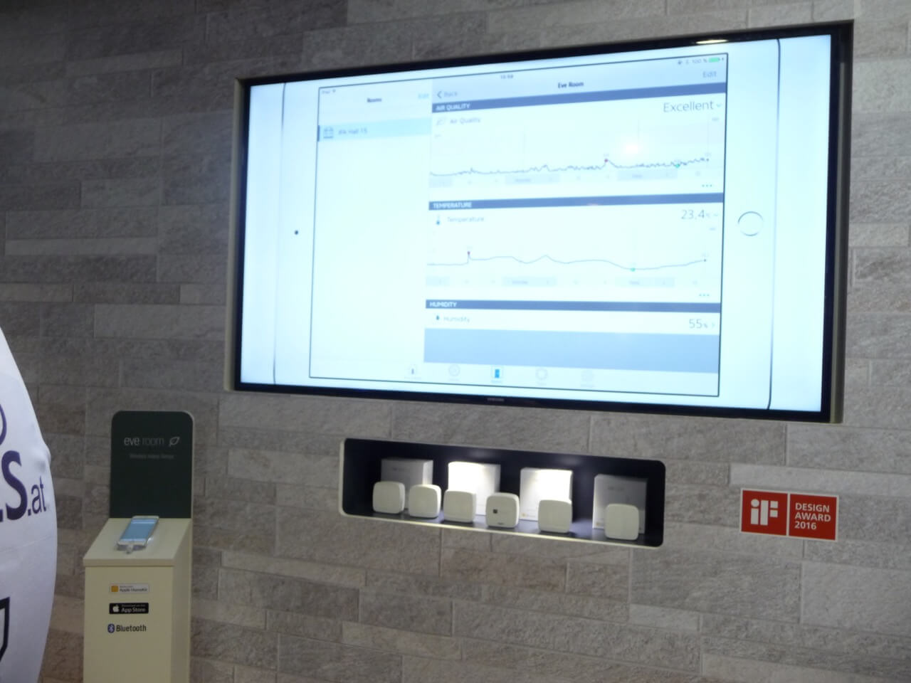 Die HomeKit-fähige Eve-Produktfamilie sammelt Daten zu Luftqualität, Temperatur, Luftfeuchtigkeit, Luftdruck, Energieverbrauch und vielem mehr. Diese Einblicke helfen euch, eure Wohn- und Lebensqualität zu verbessern. Auch auf der IFA 2016 wurden diese Daten gemessen, und es wurde uns schmunzelnd bestätigt, dass mittlerweile die Luftqualität deutlich besser wurde. Beim Verlegen von Teppichen und Böden wird natürlich einiges aufgewirbelt, was die Eve-Produkte selbstverständlich bemerkten!
