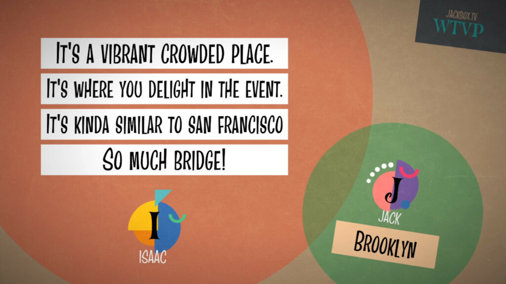 Euch erwarten wie oben beschrieben fünf Spiele in diesem Spiele-Pack. Die Spiele darin heißen Quiplash 3, The Devils and the Details, Champ’d Up, Talking Points und Blather ‚Round. Eigentlich wäre das Jackbox Party Pack 7 dafür gedacht, dass alle am selben Ort sind und auf den selben Bildschirm sehen. Natürlich macht ein Spiel am meisten Spaß, wenn ihr die Reaktionen der anderen seht, wenn ihr etwas besonders Fieses anstellt. Ein gutes Beispiel hierbei ist der rote oder der Stachi-Panzer etwa in einem Mario Kart 8 – und in diesem Jackbox Party Pack 7 ist es ähnlich geartet.