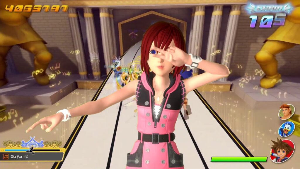 In Kingdom Hearts Melody of Memory erwartet euch ein klassisches Rhythmus-Game. Wer schon einmal Guitar Hero oder ähnliche Ableger gespielt hat, weiß im Grunde schon genau, was hier läuft! Eure drei Protagonisten – in der Demo sind dies Sora, Donald und Goofy – laufen auf festgelegten Pfaden einen Kurs entlang. Jeder Level hat ein anderes Musikstück als Spielthema, und im Takt zu dieser Musik müsst ihr Knöpfe drücken.