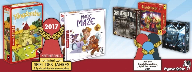 Der Kritikerpreis „Spiel des Jahres“ wird seit 1979 verliehen und gilt als weltweit bedeutendste Spieleauszeichnung. Die Auszeichnung soll insbesondere im Bereich der Familienspiele eine Orientierung im stetig wachsenden Spielemarkt bieten. Auf der Empfehlungsliste für Kennerspiele finden sich von Pegasus Spiele zudem Captain Sonar und Great Western Trail sowie das Antikriegsspiel Les Poilus des Vertriebspartners Sweet Games. Auf die Nominierung von Mmm! zum Kinderspiel des Jahres folgte dieses Jahr mit der Empfehlung von Zauberei hoch drei eine weitere Auszeichnung des noch jungen Kinderspiele-Sortiments.