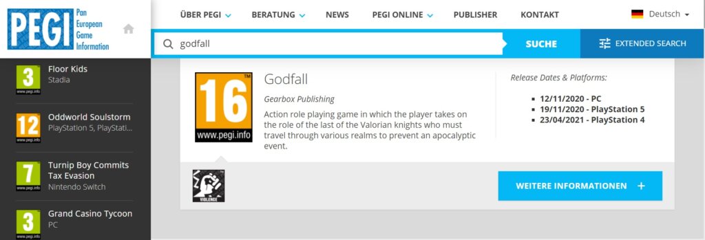 Steht uns ein Godfall PS4 Release bevor? Geht es nach der Pan European Game Information (kurz PEGI) dann ja (zum Listing-Eintrag). Neben den bereits im November letzten Jahres veröffentlichten Versionen für die PS5 und den PC wurde das Spiel nun von der PEGI mit dem 16er-Siegel ausgezeichnet.