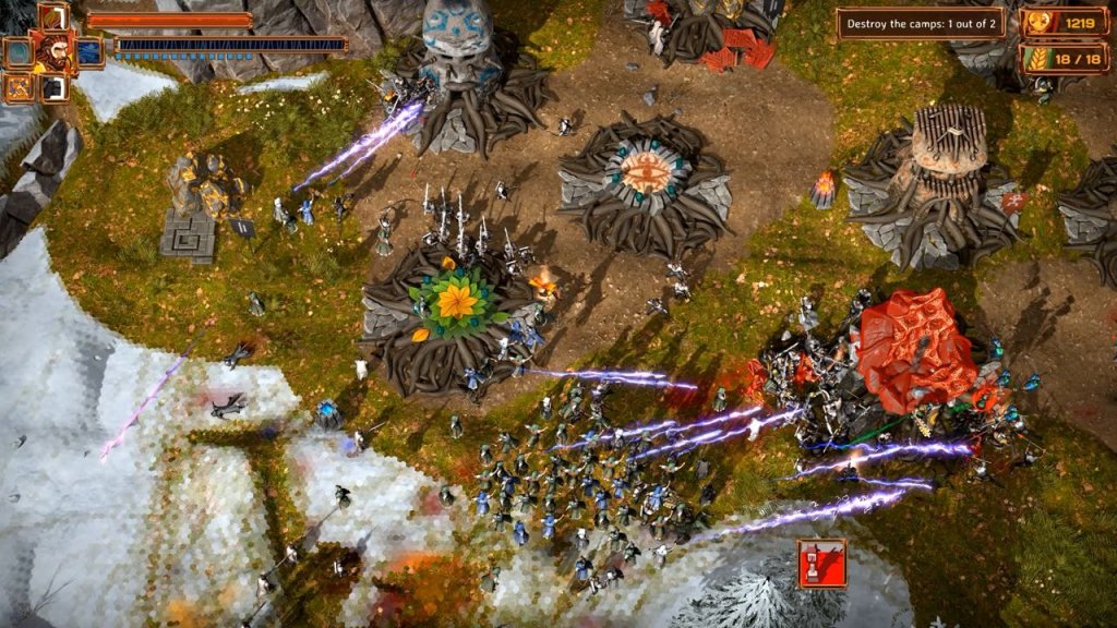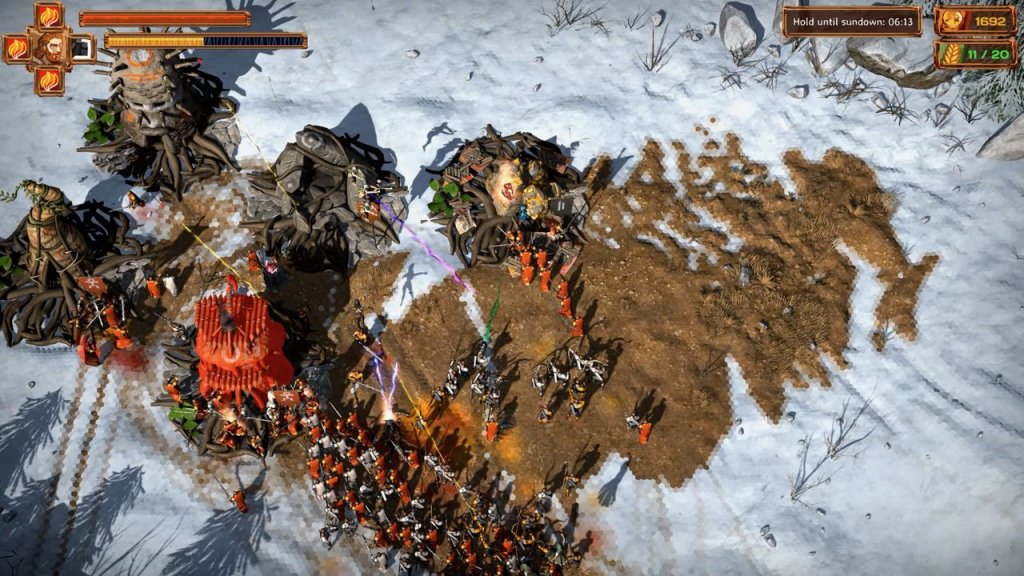 Lornsword Winter Chronicle führt euch Schritt für Schritt an das Spiel heran. Einiges am Tutorial ist verbesserungswürdig, doch nach einigen Spielrunden wisst ihr, was ihr tun müsst. Wichtig ist, dass ihr Altare bauen könnt und mit ihnen Geister rufen dürft. Sie helfen euch für begrenzte Zeit – Feuerbeschwörungen etwa sind gegen Gruppen effektiv, wohingegen Steingolems Gebäude regelrecht auseinandernehmen. Doch Vorsicht: Mit jedem Spurt und einer Beschwörung neigt sich eure Ausdauer dem Ende zu. Sie erholt sich zwar langsam, aber nur in eurer Basis könnt ihr sie wirklich rasch wieder aufladen. Es gilt also, hier nicht kopflos ins Gemetzel zu stürmen, um dann im Endeffekt zu wenig Ausdauer für die notwendige Beschwörung zu haben. Daher dürft ihr immer wieder Stationen aufbauen, was euch Gold kostet.