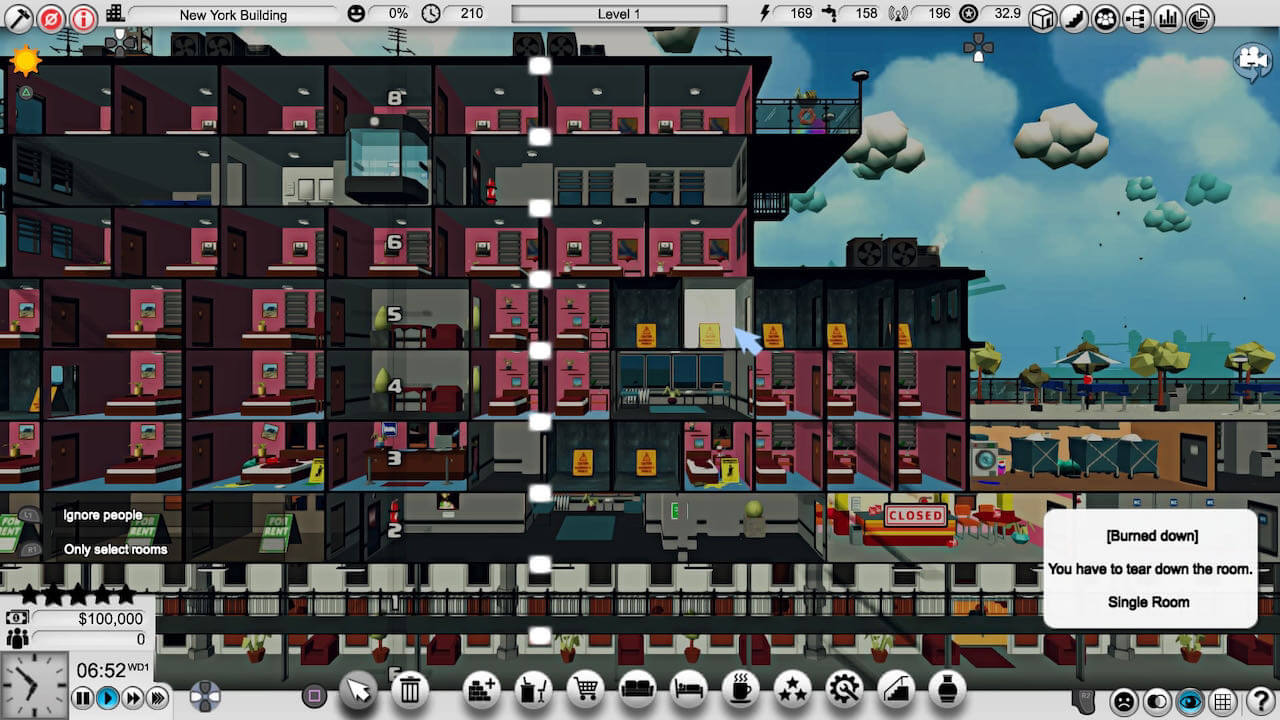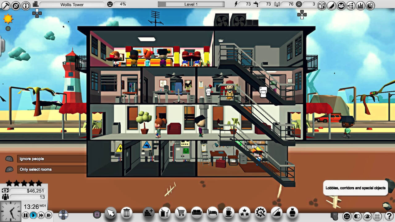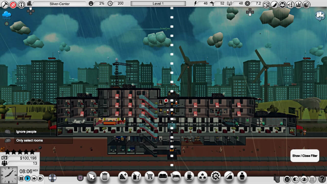 Wenn ihr dann im Spiel seid, entpuppt sich der Titel als typischer Vertreter seines Genres. Als Aufbau-Simulation werdet ihr nur selten in normaler Geschwindigkeit zusehen, wie sich eure BesucherInnen im Turm aufhalten. Es geht da eher darum, möglichst rasch kritische Infrastruktur wie Treppen, Lifte, WCs, Stromversorgung, Restaurants, Eigentumswohnungen und schöne Prestige-Räume wie eine Bücherei in euren Turm zu bekommen. Dazu gibt es einen Zeitraffer in Mad Tower Tycoon, ähnlich wie in Die Sims dürft ihr so die Zeit schneller laufen lassen oder gänzlich anhalten.