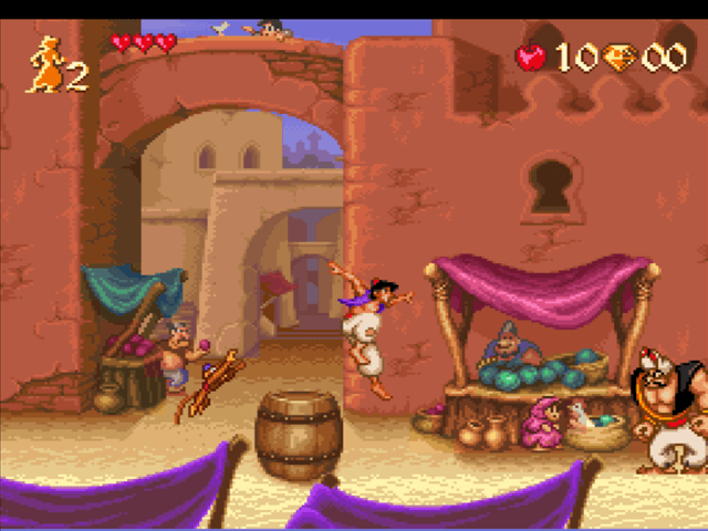 In der guten alten Zeit machten Videospiele zu Filmen tatsächlich Spaß! Als Vertreter für beliebte Disney-Spiele der SNES-Zeit hätte hier auch Mickey Mania oder The Lion King stehen können, doch mein persönlicher Favourit ist Disney’s Aladdin. Oder wie man es auch nennen könnte: Das bessere Prince of Persia.