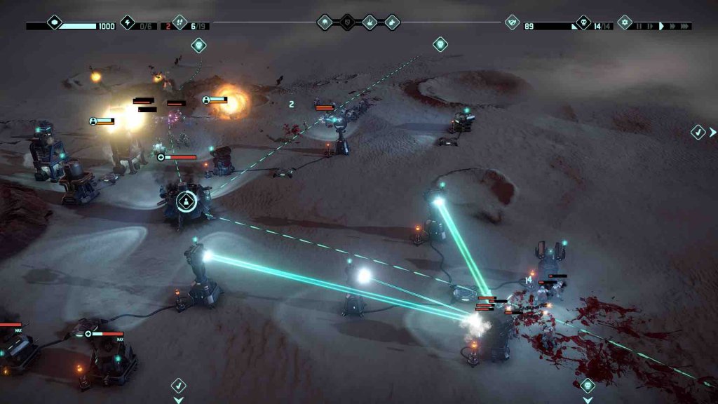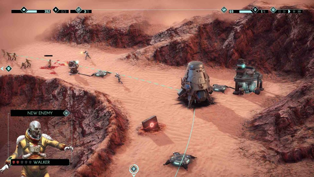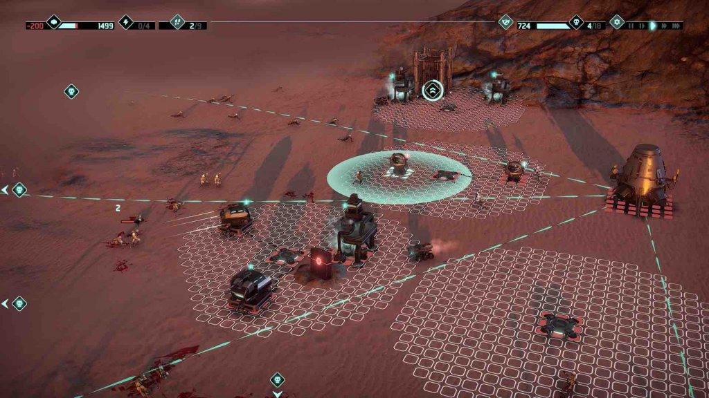 Jede eurer Stages beginnt mit einer Basis. Dieses Zuhause ermöglicht es euch, sowohl Stromgeneratoren als auch Minen zu bauen. Jeder Stromgenerator kann dann wiederum eigene Gebäude wie etwa Geschütztürme bauen und in seinem Umkreis versorgen. Das ist wichtig, denn ohne Strom funktioniert nun mal nichts.
