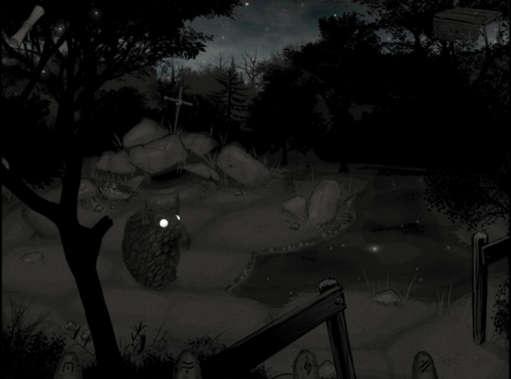 Neben einer grobgezimmerten Holzkiste, in der unser gedrungenes Geschöpf gefundene Gegenstände aufbewahren und miteinander kombinieren konnte, führte es Buch über die Probleme, die es noch zu lösen galt. Dadurch verlor es nie das eigentliche Ziel aus den Augen, auch wenn es den Weg dahin nicht immer kannte. Doch das kleine Wesen war nicht nur findig, es konnte sich auch elementarer Magie bedienen: Vier Runen – Erde, Wasser, Feuer, Luft – gaben ihm die Macht seine Umwelt auf unterschiedliche Arten zu verändern und so in seiner Reise voranzukommen.