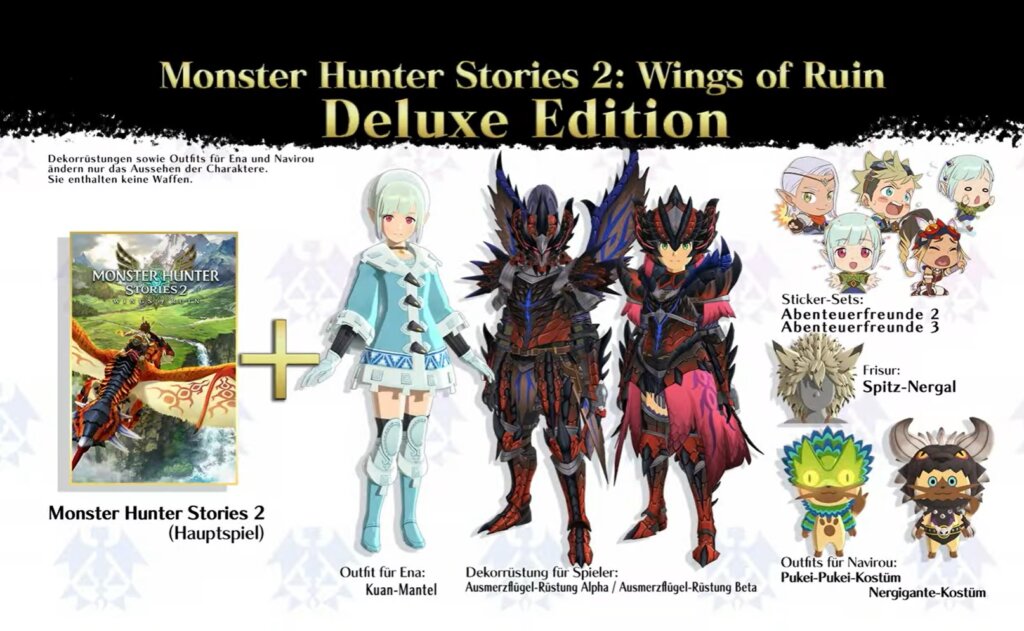 Nach dem Trailer enthüllte Ryozo die Inhalte der Deluxe Edition von Monster Hunter Stories 2: Wings of Ruin, Vorbesteller-Boni, drei amiibo-Figuren, die zeitgleich mit dem Spiel erscheinen, sowie Speicherdaten-Belohnungen für jene, die Monster Hunter Rise spielen. Die Deluxe Edition enthält die Ausmerzflügel-Dekorrüstung und eine, vom Nergigante inspirierte, Frisur für SpielerInnen, das Kuan-Outfit für die Wyverianische Gefährtin Ena, zwei neue Outfits für Navirou und zwei Aufkleber-Sets, die die diversen Charaktere des Spiels abbilden. SpielerInnen, die Wings of Ruin auf jedweder Plattform vorbestellen, erhalten das Kamura-Mädel-Outfit für Ena, während Spieler der Nintendo Switch-Version mithilfe der amiibo-Figuren von Ena, Ausmerzflügel und Tsukino drei verschiedene Dekorrüstungen und tägliche Boni freischalten können. Zu guter Letzt steht jenen SpielerInnen mit Speicherdaten von Monster Hunter Rise die Kamura-Dekorrüstung zur Verfügung. Mehr Informationen zu Preisen und Vorbestellungen werden zu einem späteren Zeitpunkt bekanntgegeben.