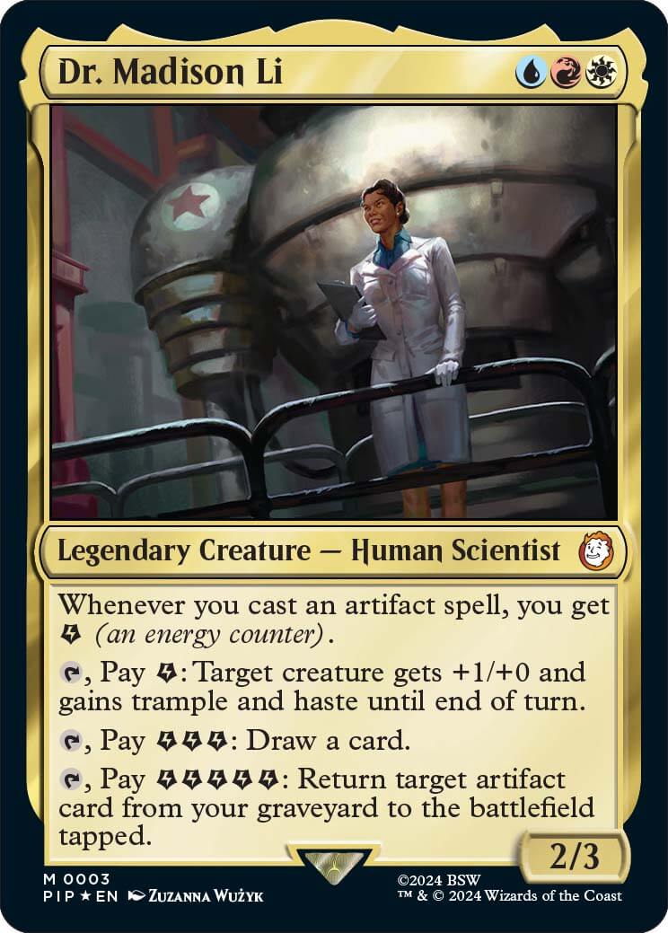 Dr. Madison Li, die auch Commander des Science! Decks ist, spielt in Fallout 3 eine tragende Rolle und verschwindet dann im Add-On Broken Steel, um erneut in Fallout 4 in Erscheinung zu treten. Das Deck dreht sich um Roboter, Artefakte und Energy Counter.