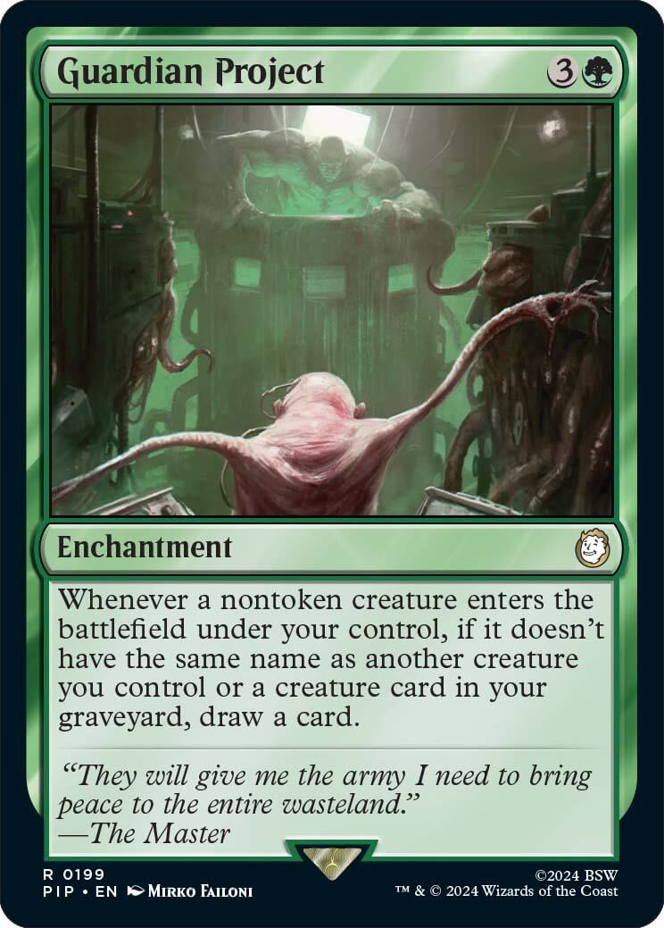 Obwohl Bethesda ja eigentlich erst mit Fallout 3 die Entwicklung an Fallout begonnen hat, gibt es natürlich auch die geliebten älteren Teile, die ebenfalls nicht fehlen dürfen. Mit der Karte Guardian Project wird der berüchtige Master aus dem ersten Fallout dargestellt und das jeder Mutant auf seine Art einzigartig ist. Der Master, der selbst aus Teilen von Menschen, Mutanten und Computerteilen besteht, hat das transhumanistische Ziel eine neue Rasse zu kreieren.