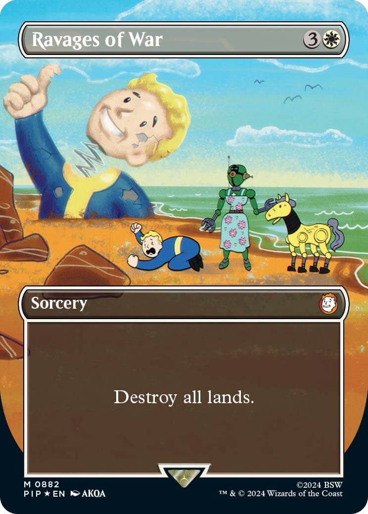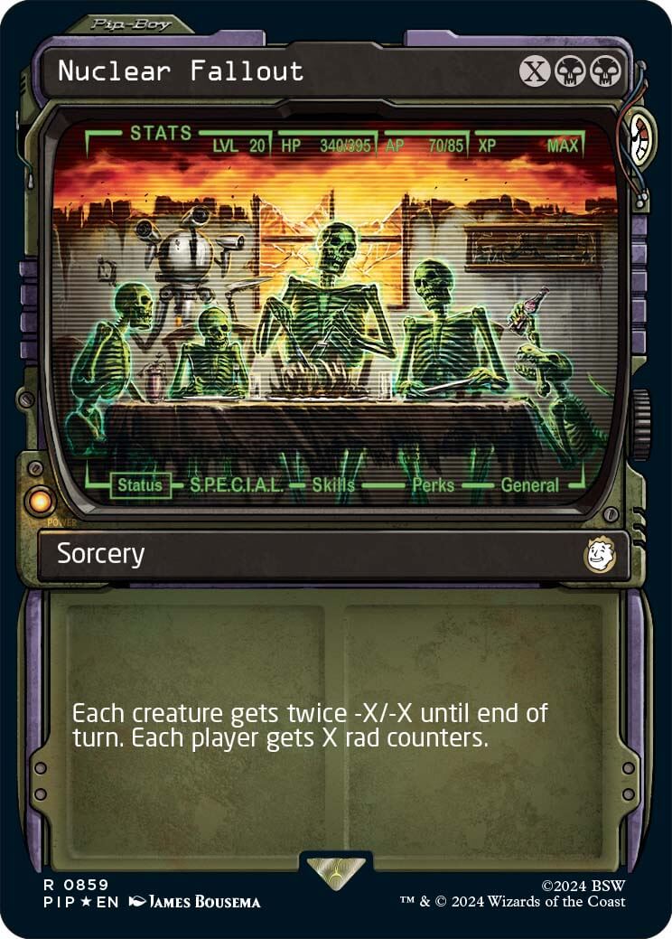 Radioktivität funktioniert via Rad-Counter, ähnlich wie z.B. auch Poison, wo die Spieler:innen die Counter bekommen. Habt ihr z.B. fünf Rad-Counter, dann müsst ihr in eurer Precombat Phase auch fünf Karte millen. Für jede Karte die gemillt wurde und kein Land war verliert ihr dann einen Lebenspunkt, jedoch auch wieder jeweils einen Rad-Counter. Das trifft sich auch mit dem Fallout Gameplay ganz gut, denn auch dort verschwinden radiokative Einflüsse nach einiger Zeit wieder. Ich bin sehr gespannt, was diese Mechanik alles an neuen Spielerlebnissen mitbringen wird.