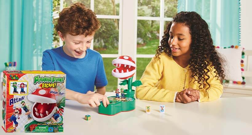 Achtung, die Piranha-Pflanze hat Hunger und schnappt schnell zu! Schafft es eure Figur über das Spielfeld zu ziehen ohne gefressen zu werden? Zieht mit der Figur auf dem Spielbrett um die Augenzahl weiter, welche der Würfel anzeigt. Dann drückt ihr den Knopf der Piranha-Pflanze so oft, wie es das Spielfeld vorgibt. Schnappt die Pflanze zu und wirft euren Helden vom Spielfeld, ist das Spiel verloren. In diesem Set für 24,99€ sind neben der riesigen Piranha-Pflanze nur Mario und Luigi zur stelle.