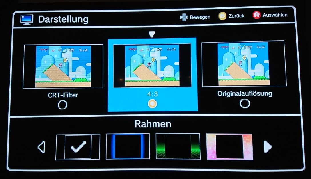 Via HDMI werden flüssige Bildfolgen in 60Hz übertragen. Zudem ist es möglich zwischen drei verschiedenen Bild-Modi zu wählen. Das Highlight ist für mich der CRT-Bildschirm-Modus, der eine Darstellung früherer Röhrenfernseher simuliert. Zum anderen können die Spiele wie seinerzeit auf dem Super Nintendo im Seitenverhältnis 4:3, aber mit gesteigerter Bildschärfe gespielt werden. Last but not least gibt es für die größten Nostalgie-Fans die Originalansicht.